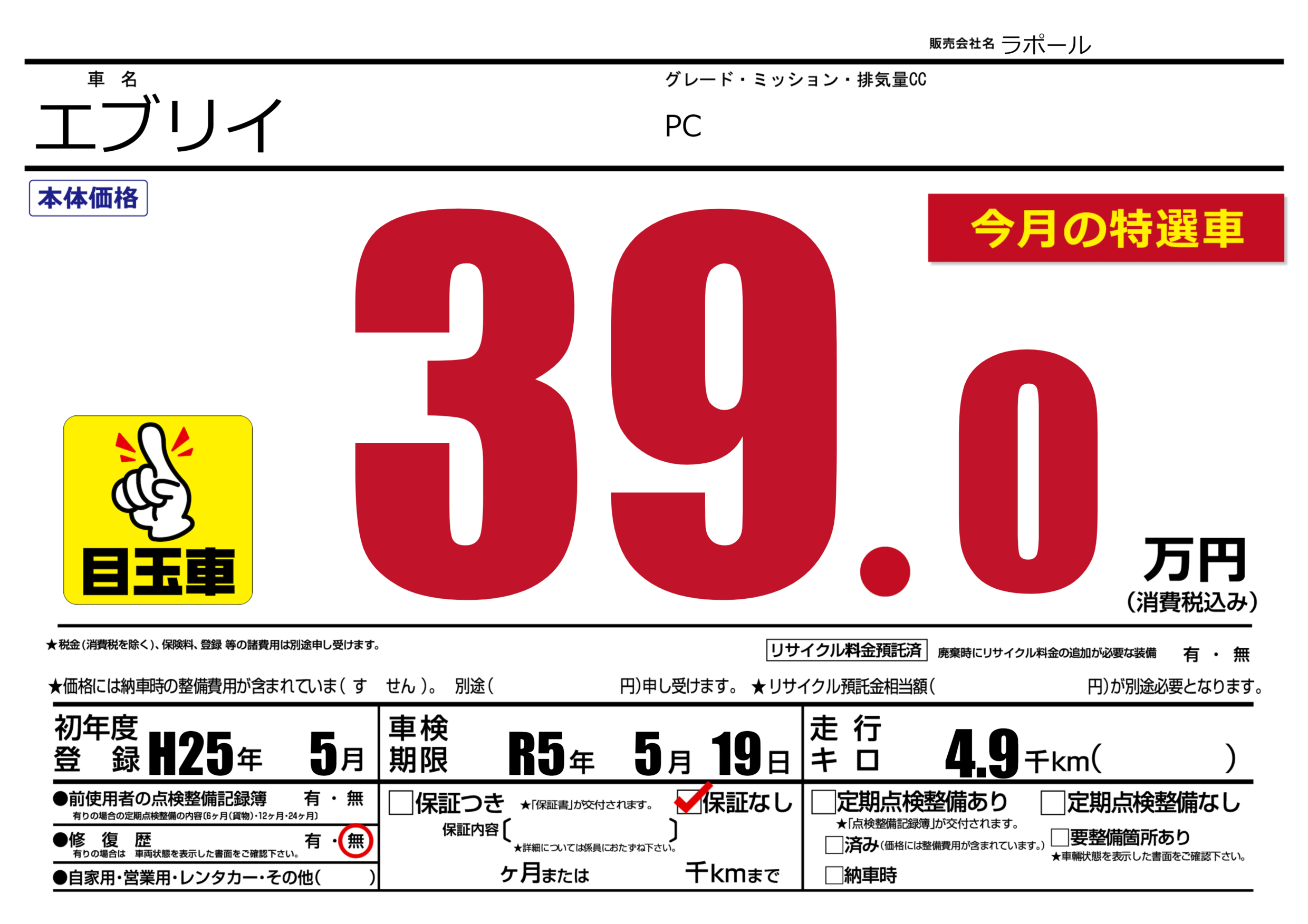 なし | 車検制限 | R5年5月19月 |