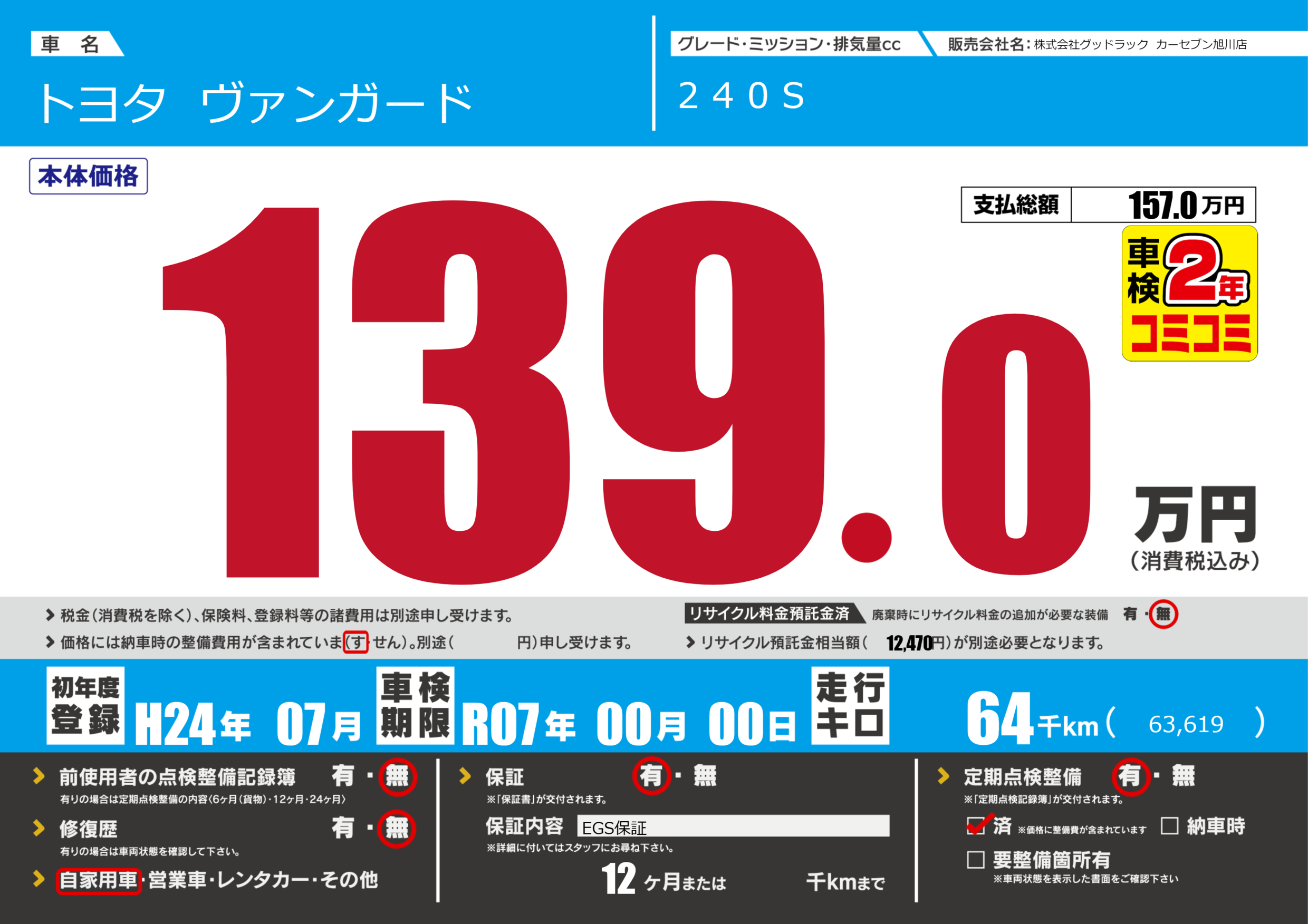 | 定期点検整備 | 定期点検整備あり 定期点検整備済み | ||