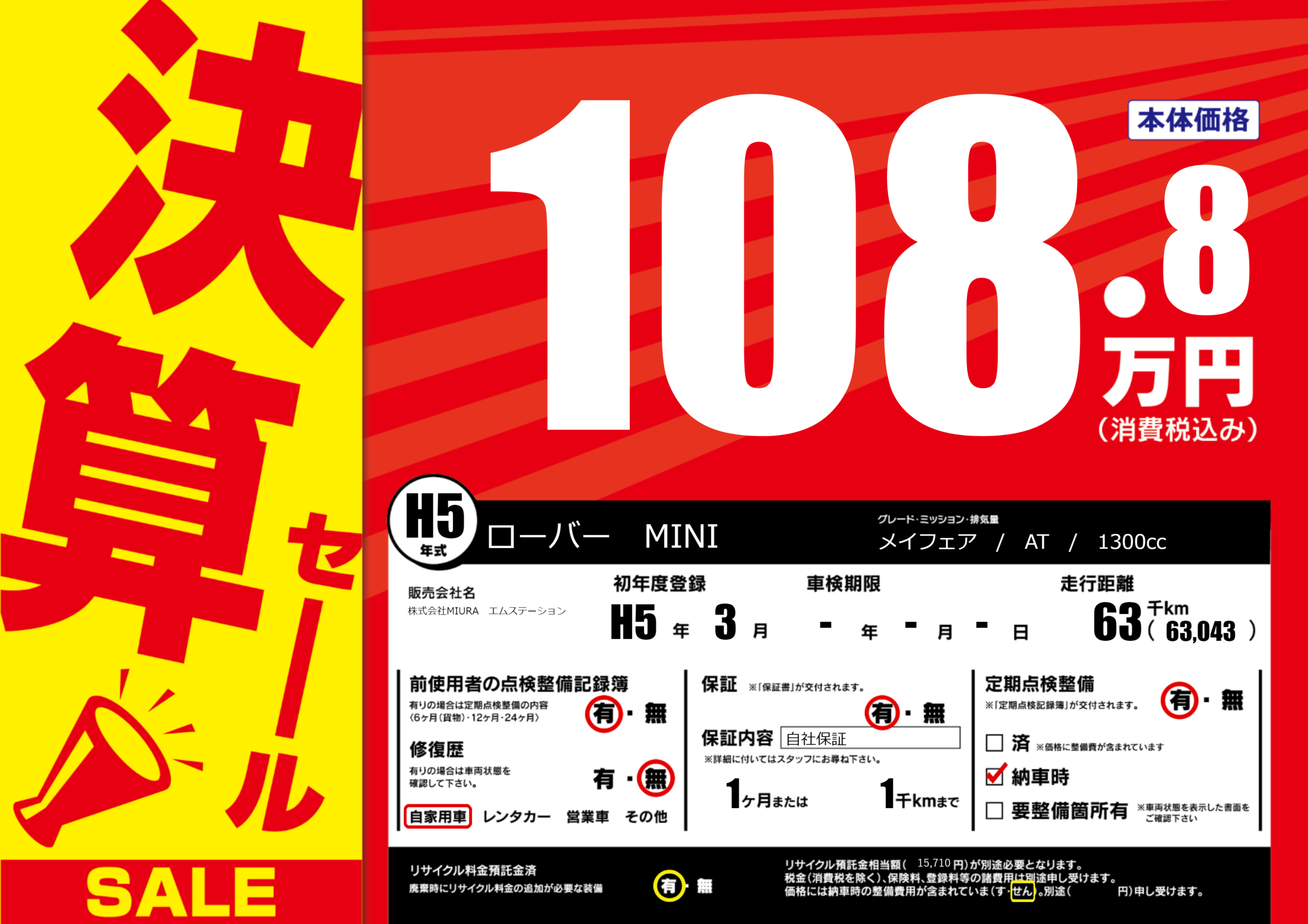 | 走行キロ | 6.3万km | 初年度登録 | H5年3月 |