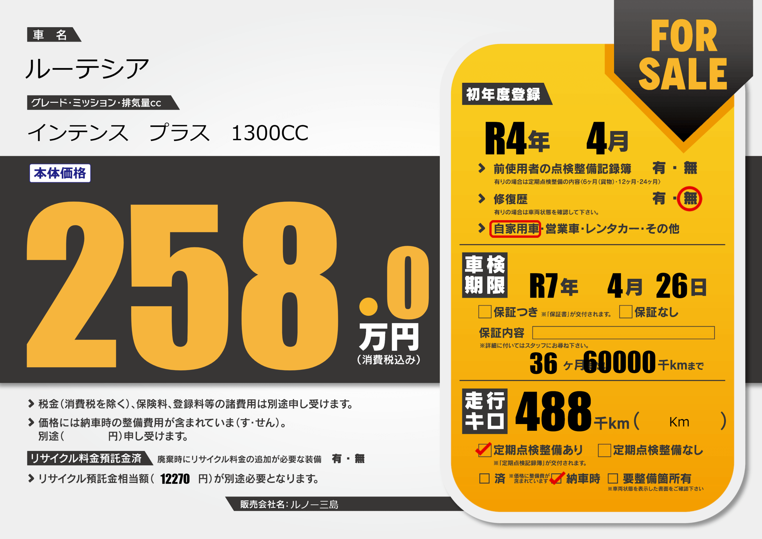 | 車名 | ルーテシア | グレード ミッション 排気量 |