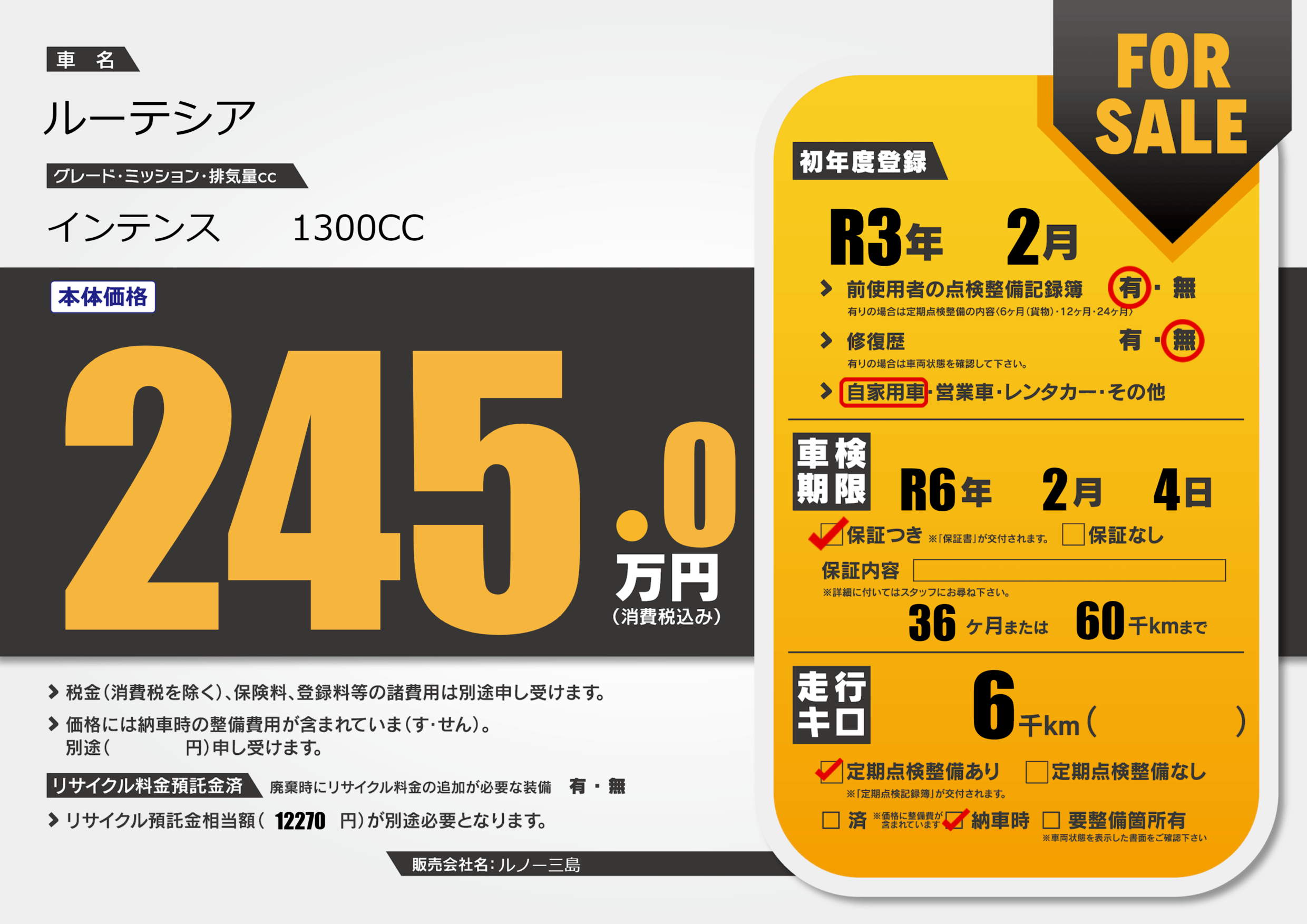 | 車名 | ルーテシア | グレード ミッション 排気量 |