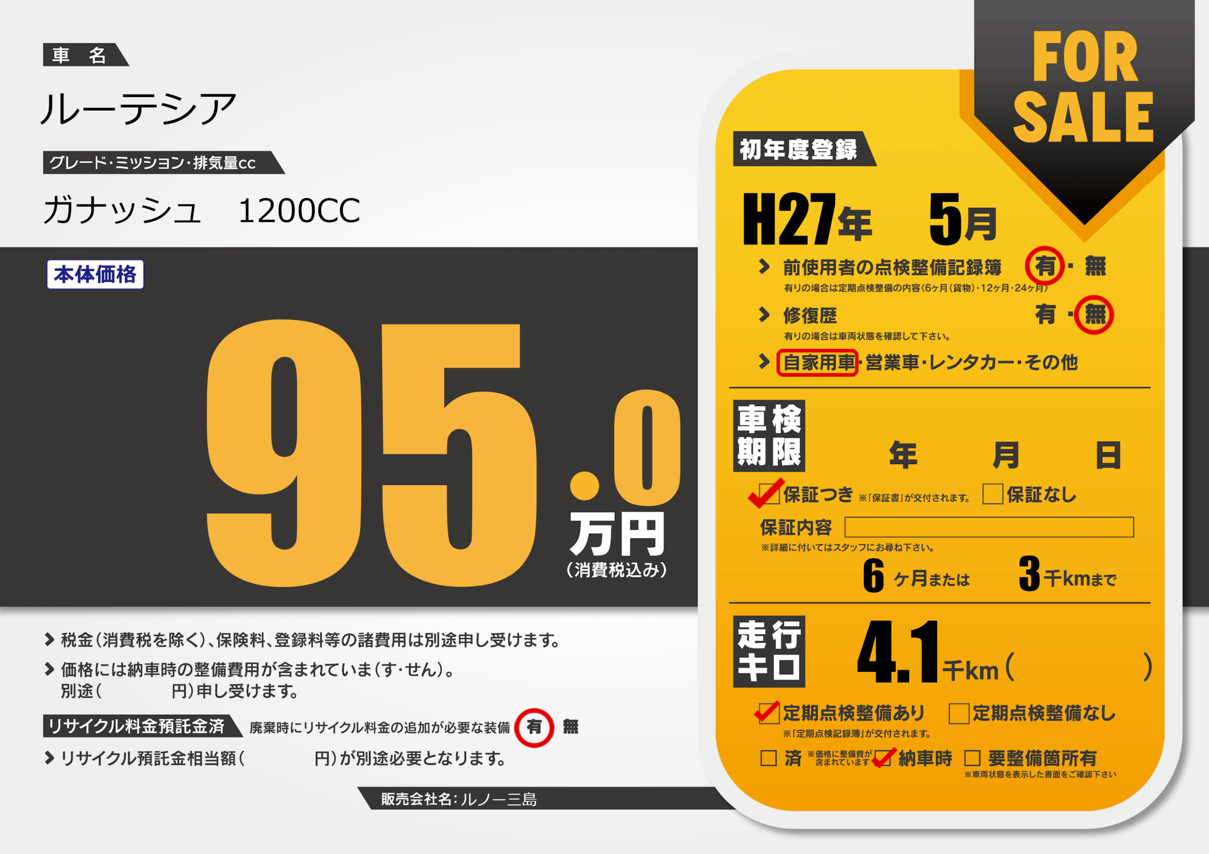 | 車名 | ルーテシア | グレード ミッション 排気量 |