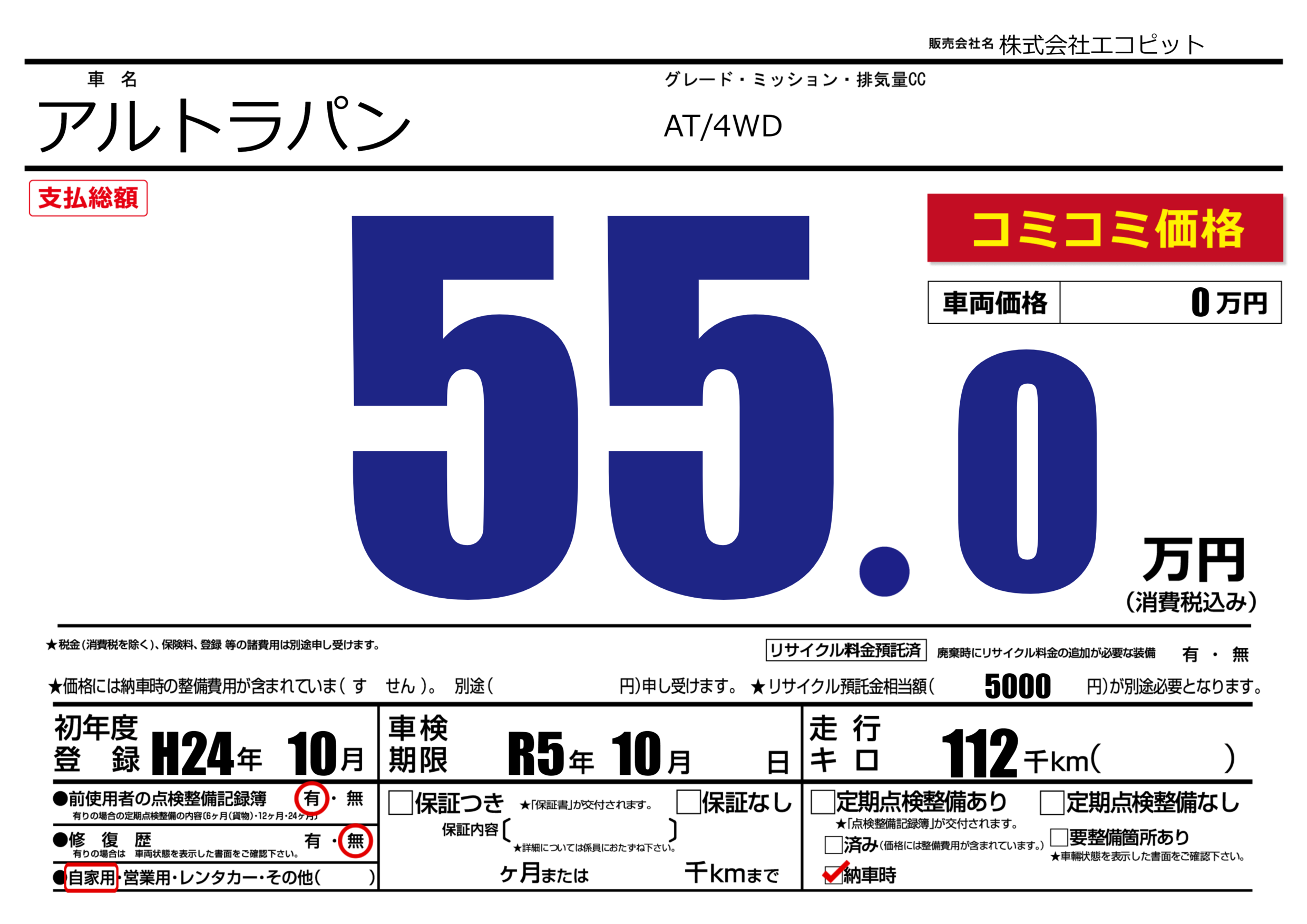 なし | 車検制限 | R5年10月---月 |
