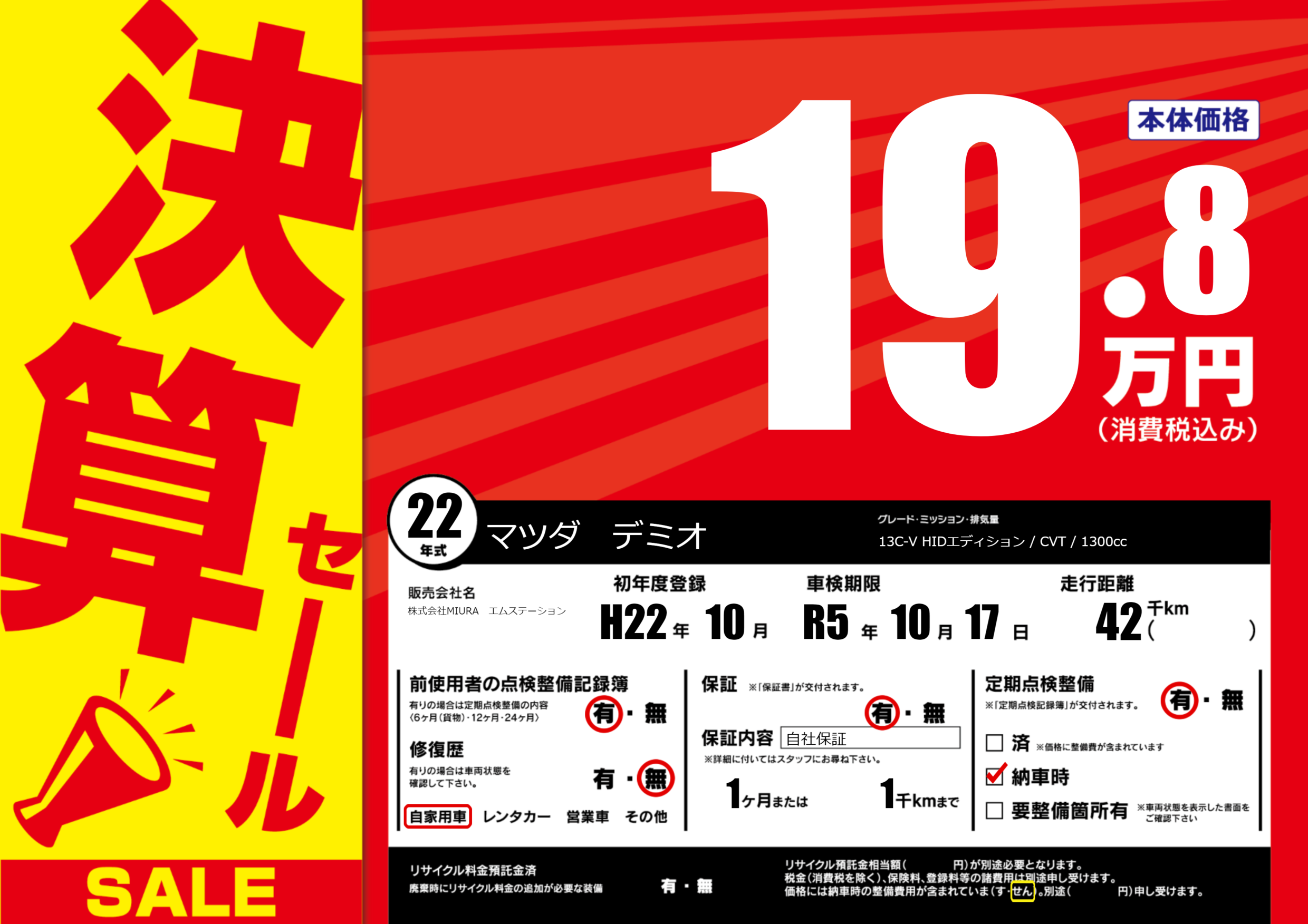 保証付き 保証内容(自社保証) 1ヶ月または(1)千kmまで |
