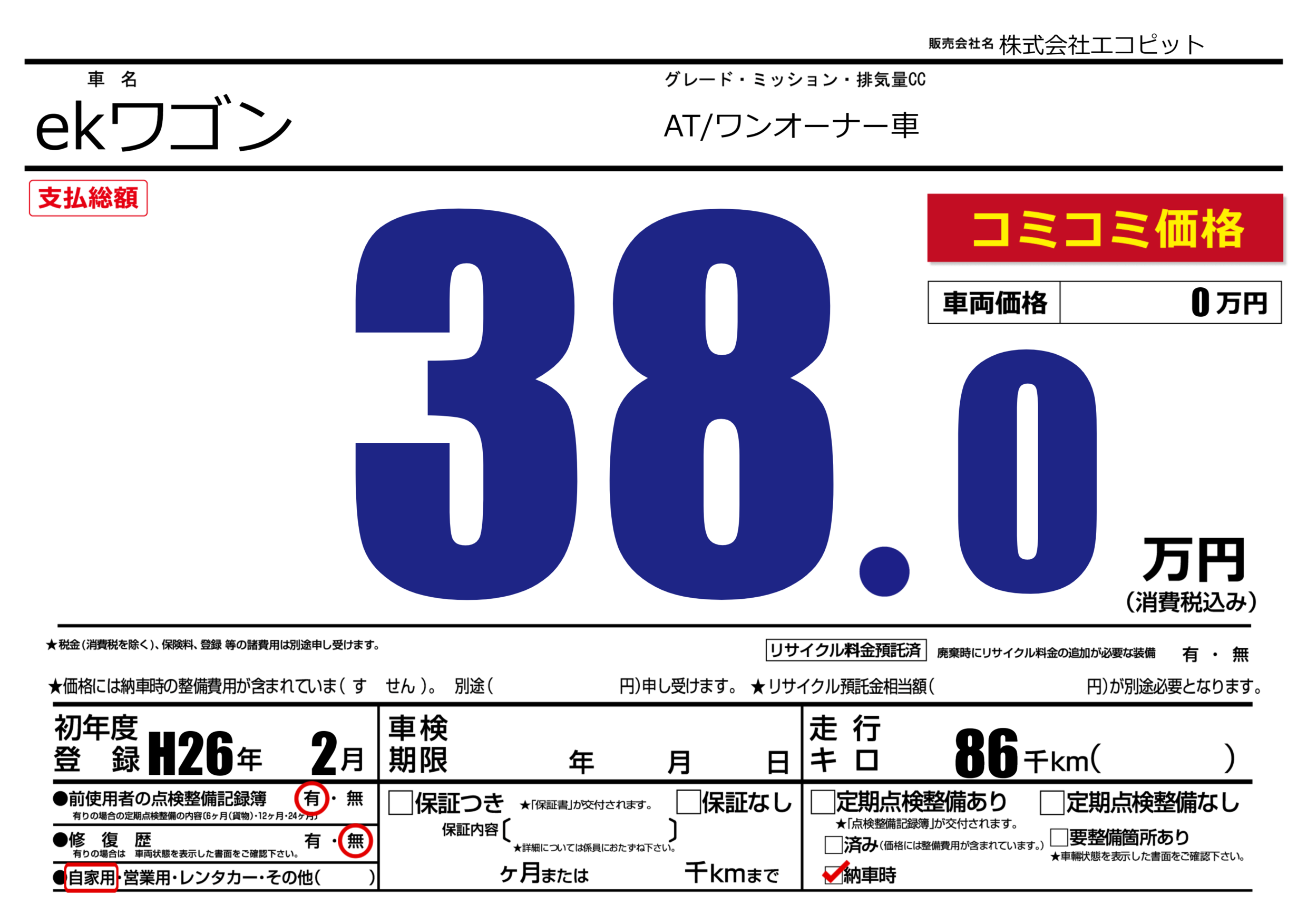 | 車名 | ekワゴン | グレード ミッション 排気量 |