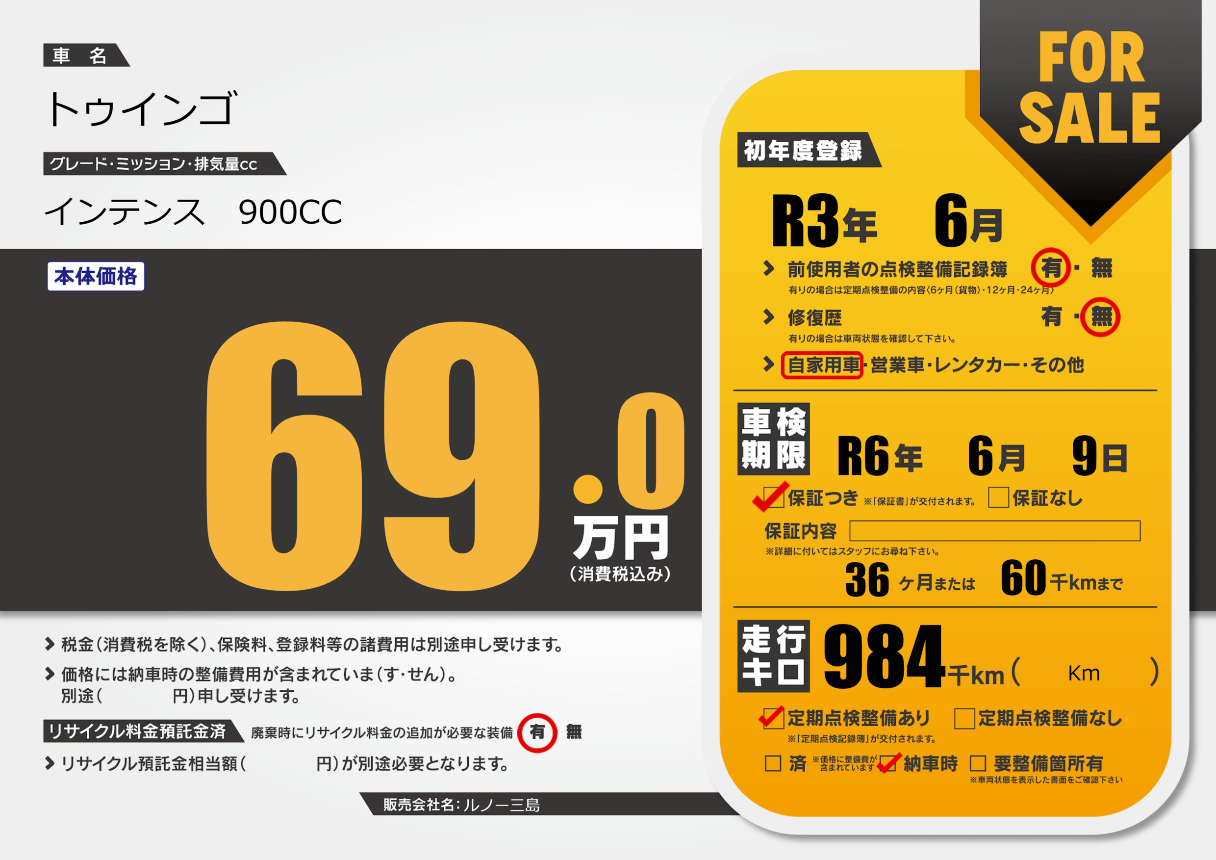 | 車名 | トゥインゴ | グレード ミッション 排気量 |