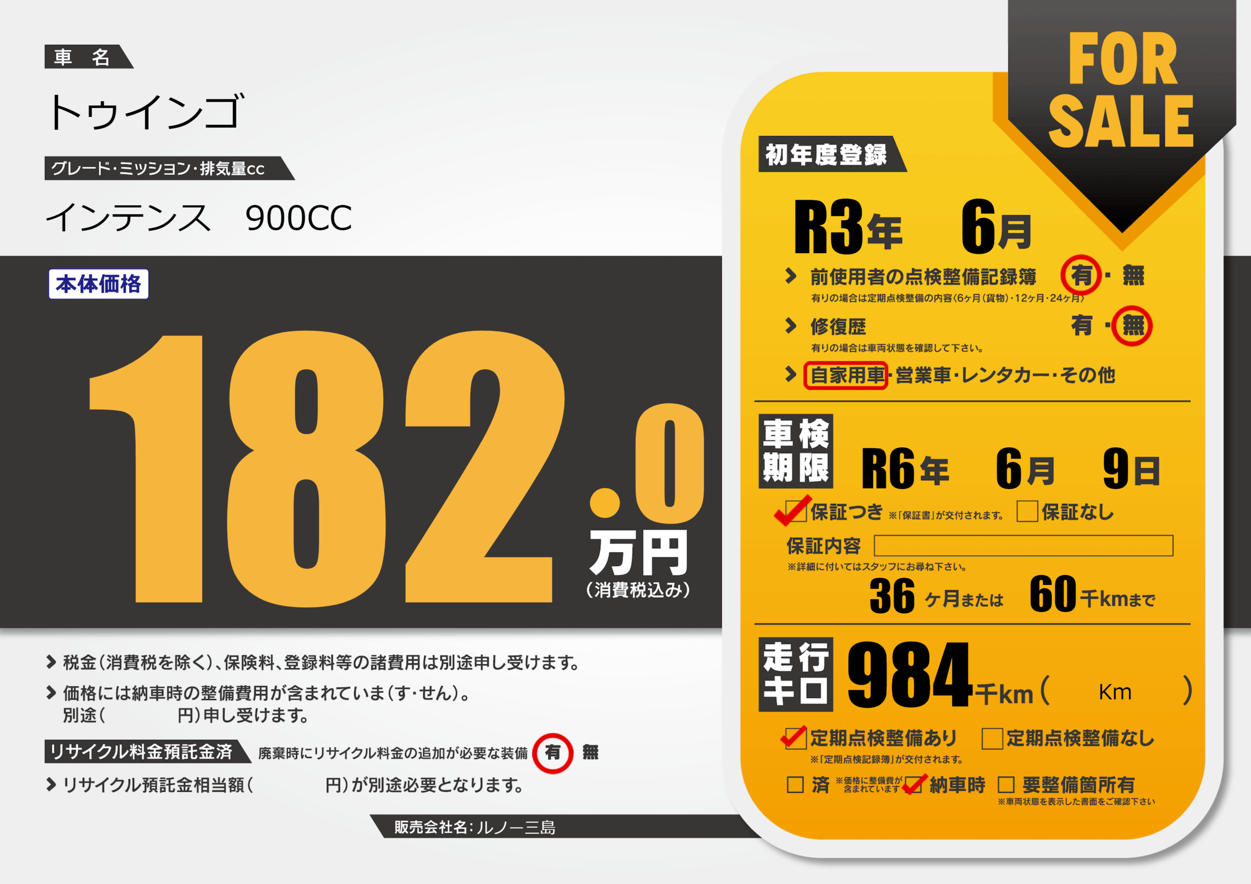 | 車名 | トゥインゴ | グレード ミッション 排気量 |