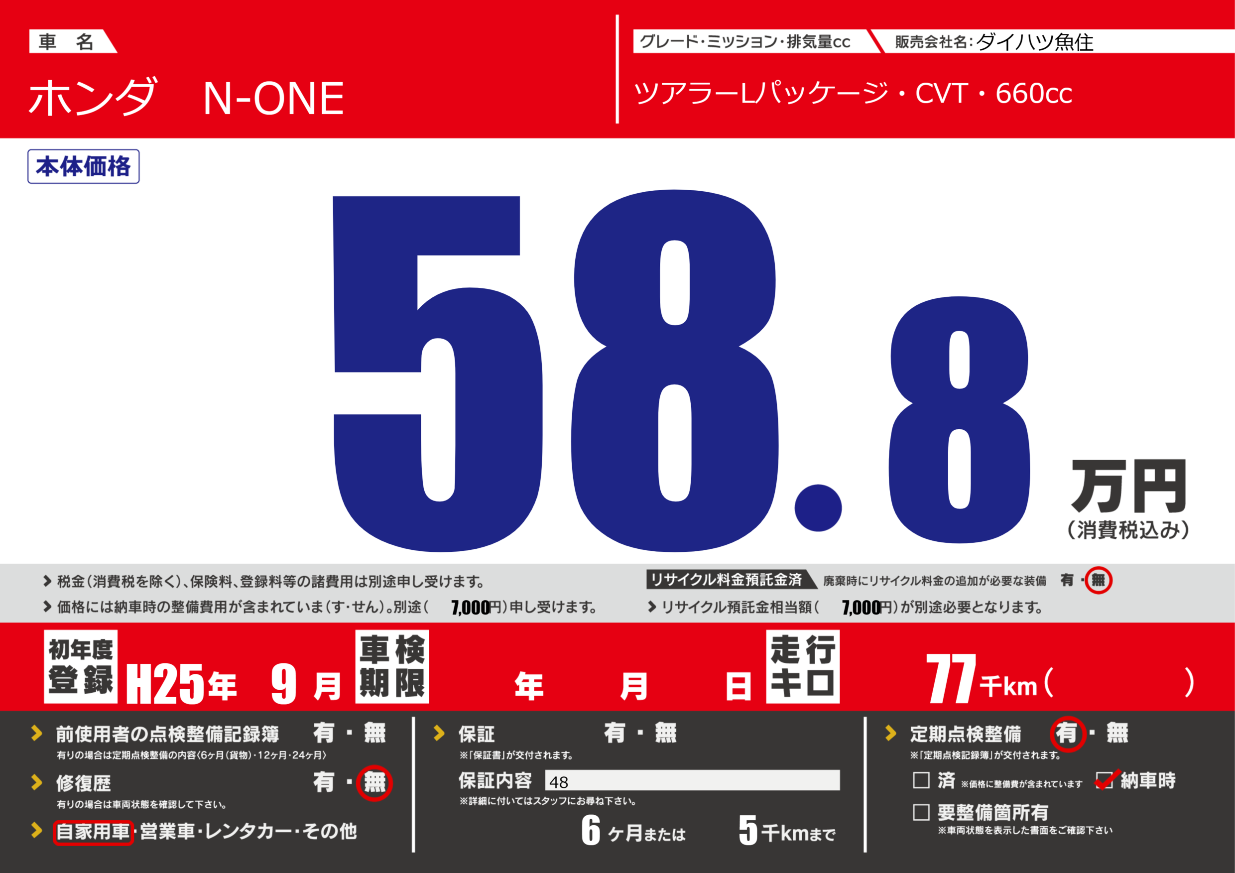 | 車名 | ホンダ N-ONE | グレード ミッション 排気量 |