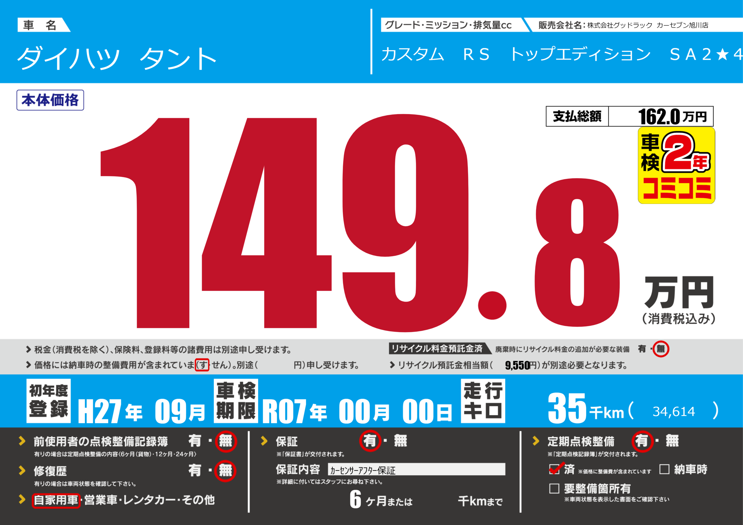 | 定期点検整備 | 定期点検整備あり 定期点検整備済み | ||