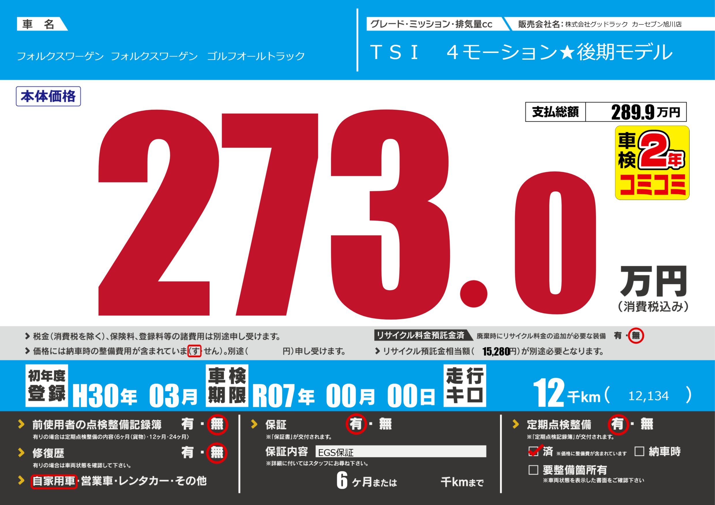 | 車名 | フォルクスワーゲン フォルクスワーゲン ゴルフオールトラック | グレード ミッション 排気量 |