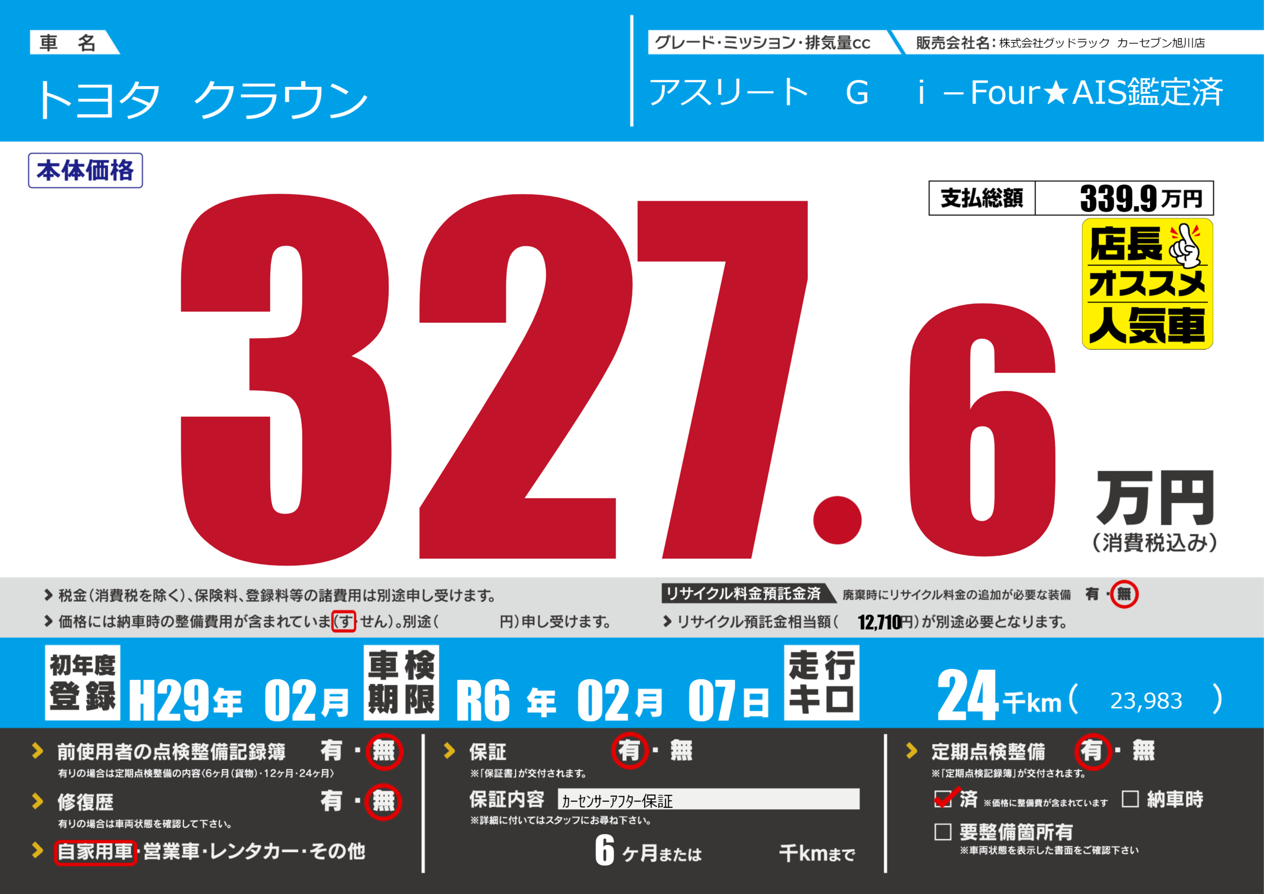 | 車名 | トヨタ クラウン | グレード ミッション 排気量 |