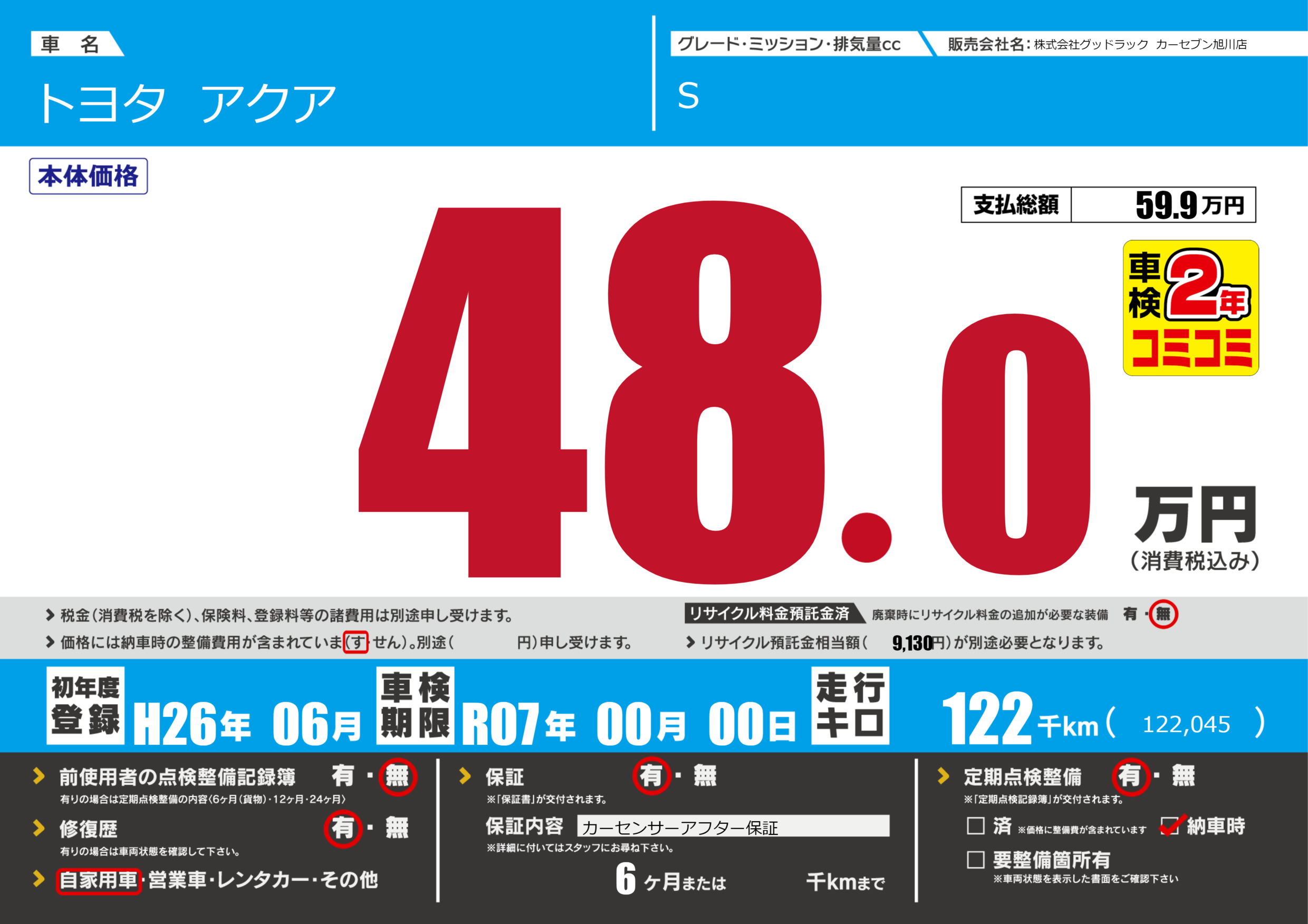 | 定期点検整備 | 定期点検整備あり 納車時あり | ||