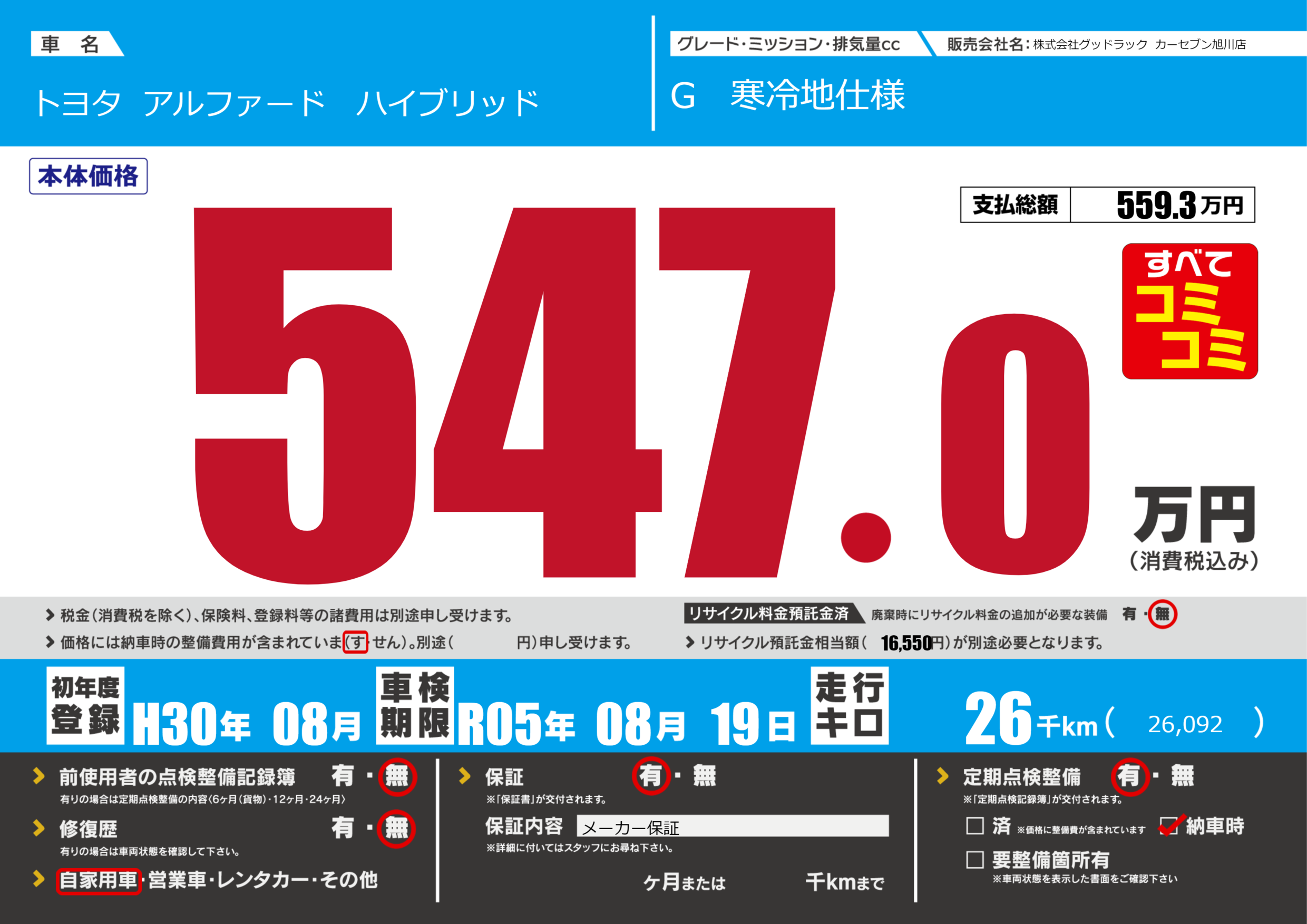 | 車名 | トヨタ アルファード ハイブリッド | グレード ミッション 排気量 |