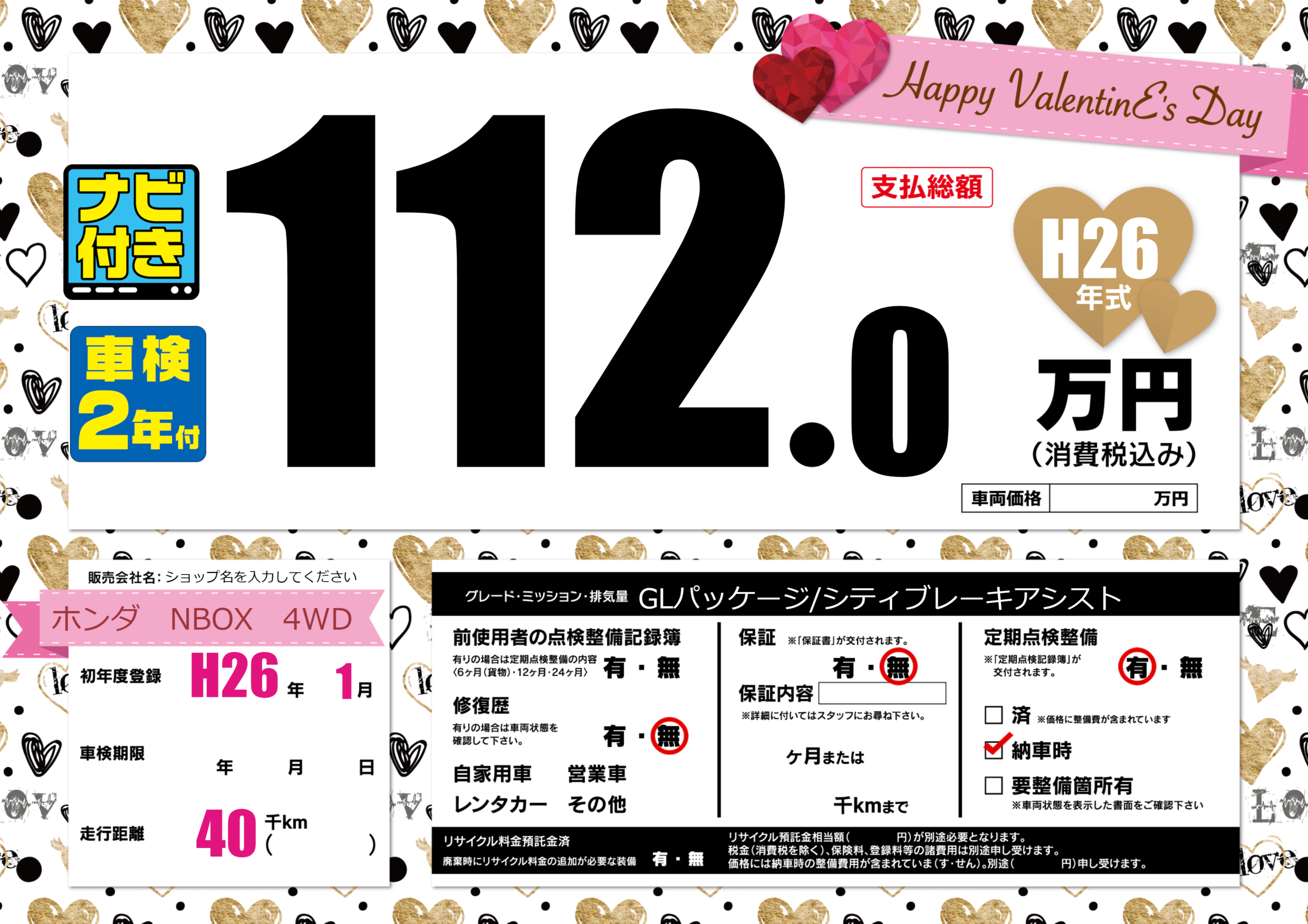 | 車名 | ホンダ NBOX 4WD | グレード ミッション 排気量 |