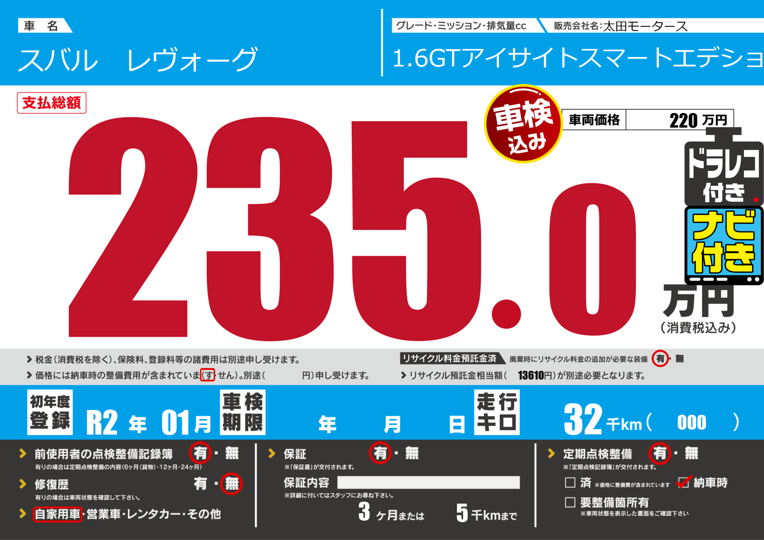 | 走行キロ | 3.2万km | 初年度登録 | R2年01月 |