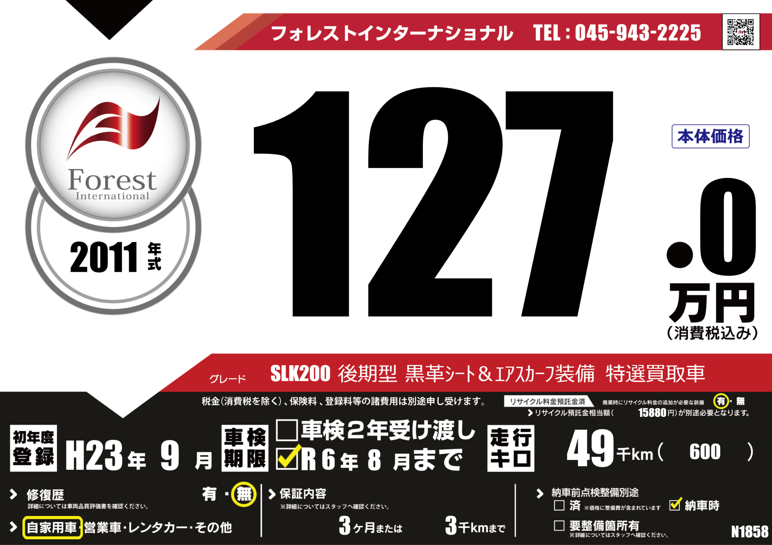 SLK200 後期型 黒革シート&エアスカーフ装備 特選買取車 |