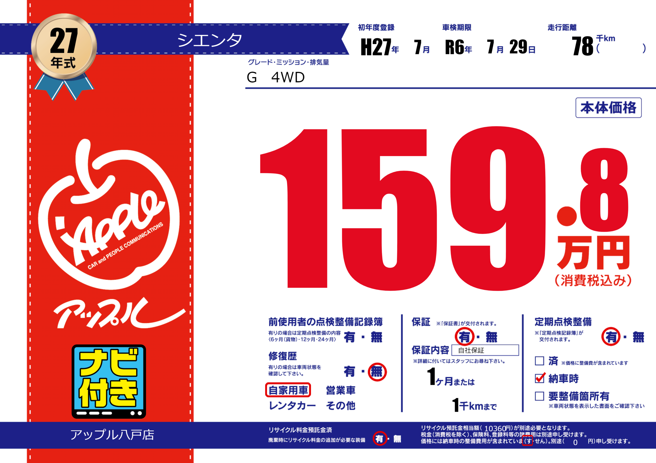 保証付き 保証内容( 自社保証) 1ヶ月または(1)千kmまで |