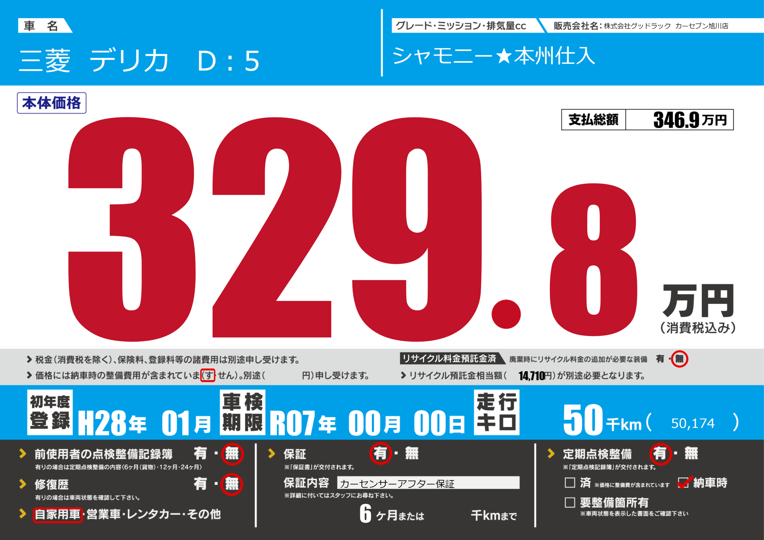 | 車名 | 三菱 デリカ D:5 | グレード ミッション 排気量 |