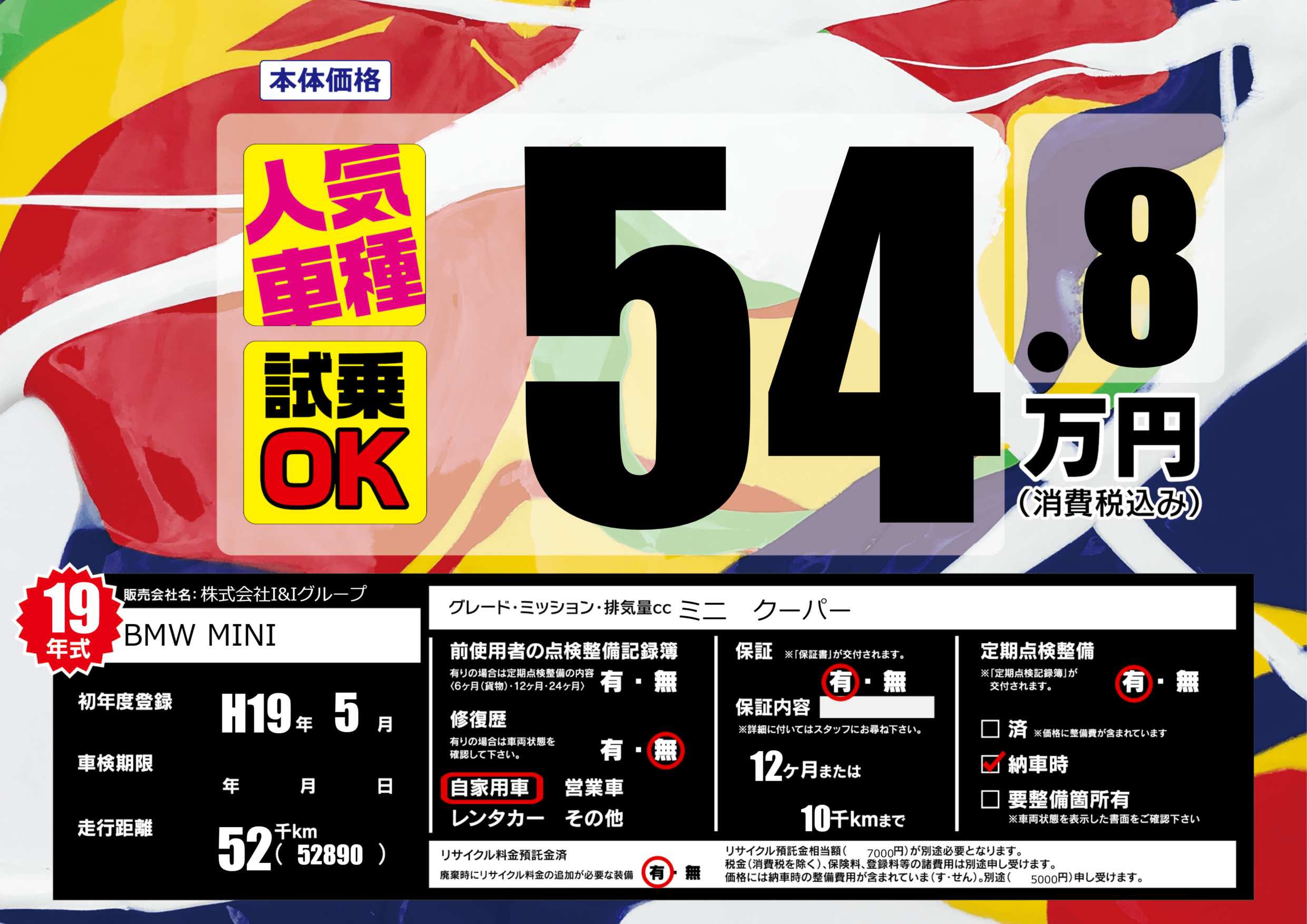 | 車名 | BMW MINI | グレード ミッション 排気量 |