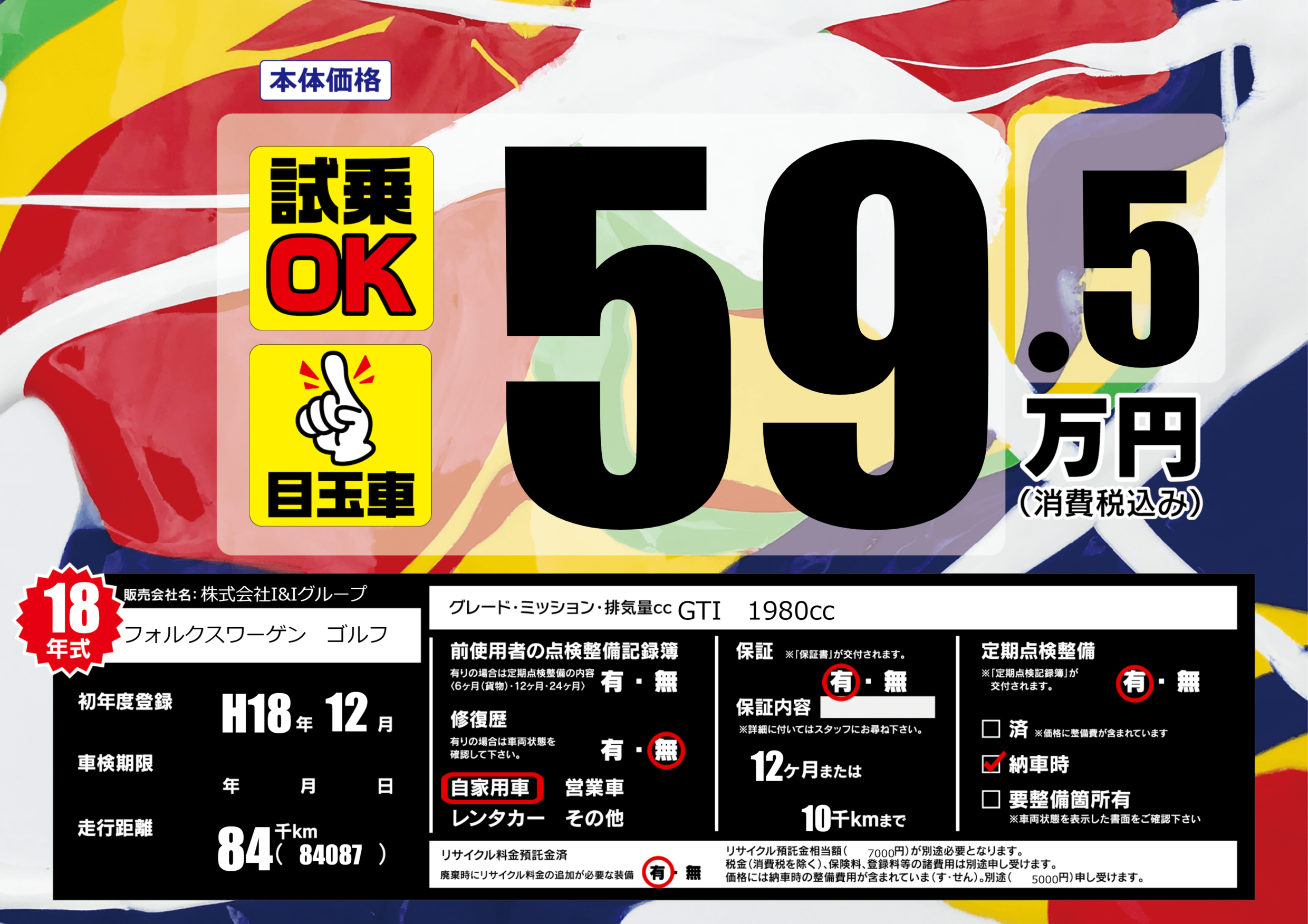 | 車名 | フォルクスワーゲン ゴルフ | グレード ミッション 排気量 |