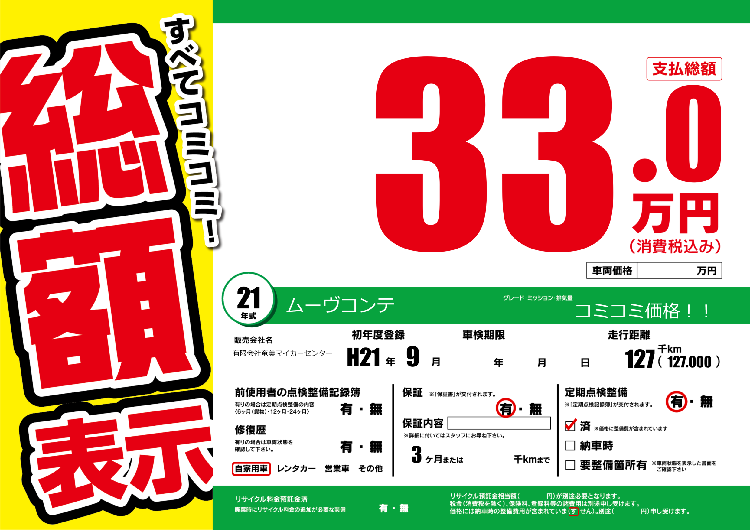 | 定期点検整備 | 定期点検整備あり 定期点検整備済み | ||