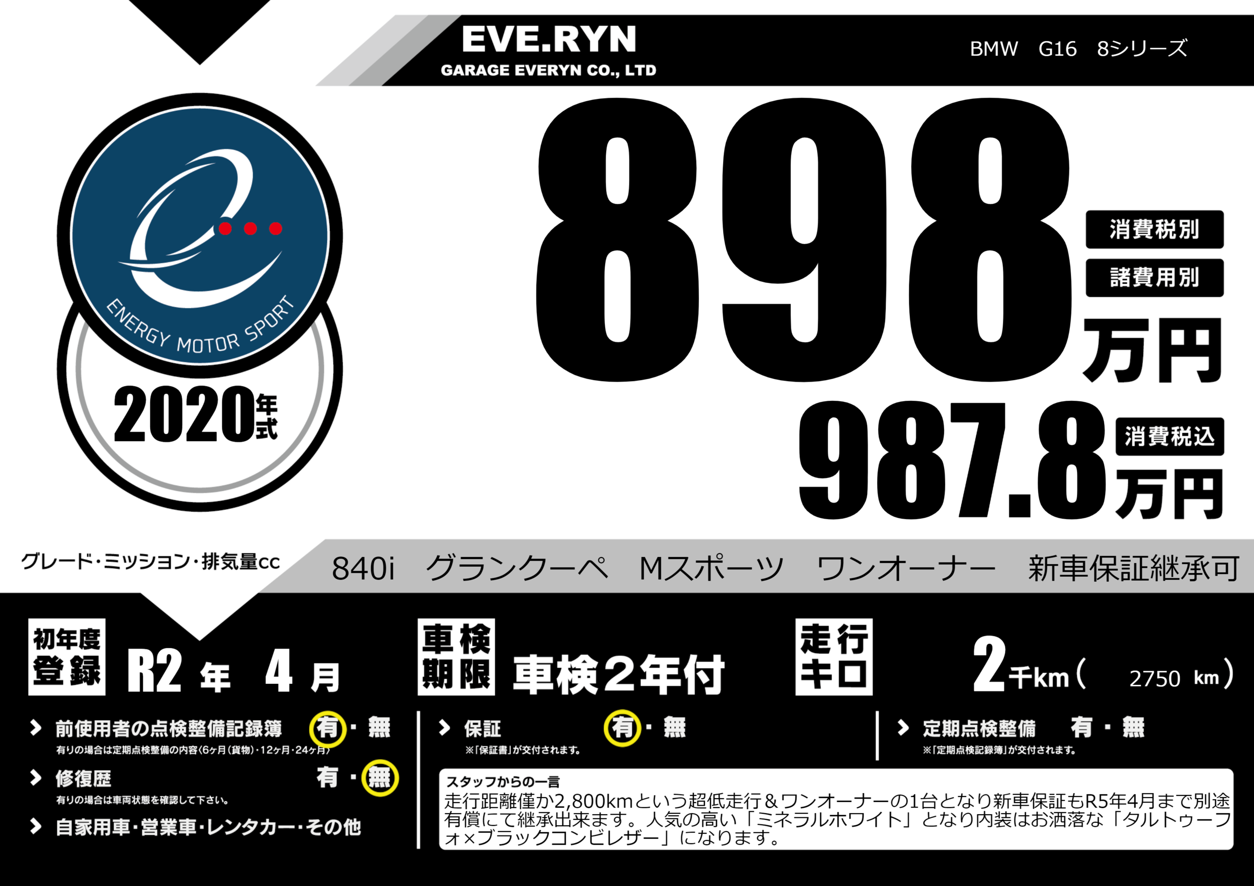 | 車名 | BMW G16 8シリーズ | グレード ミッション 排気量 |