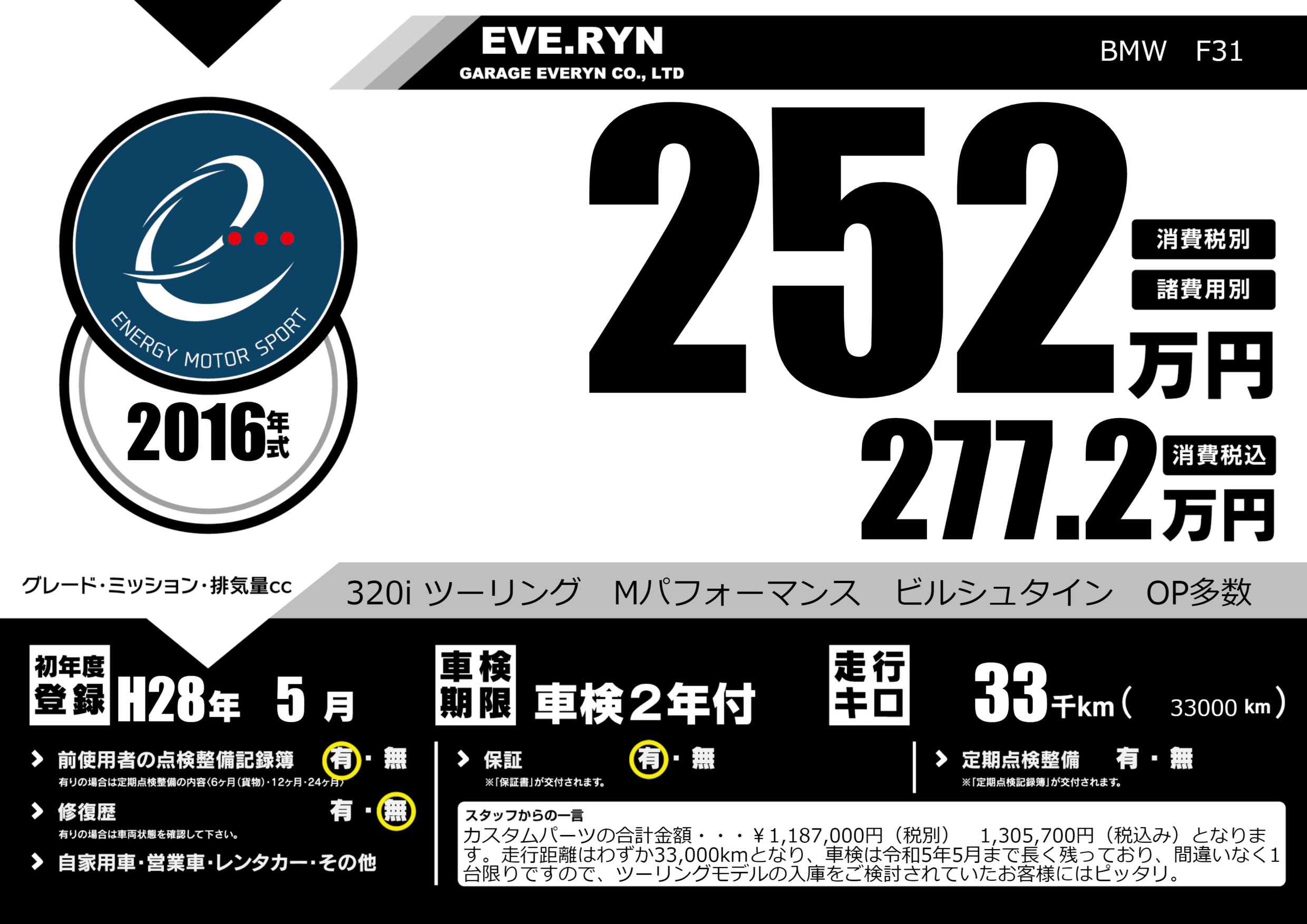 | 車名 | BMW F31 | グレード ミッション 排気量 |