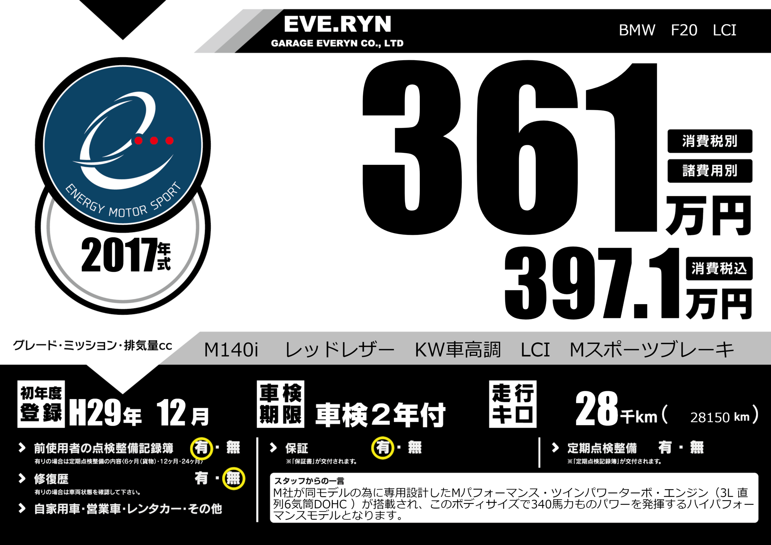 | 車名 | BMW F20 LCI | グレード ミッション 排気量 |