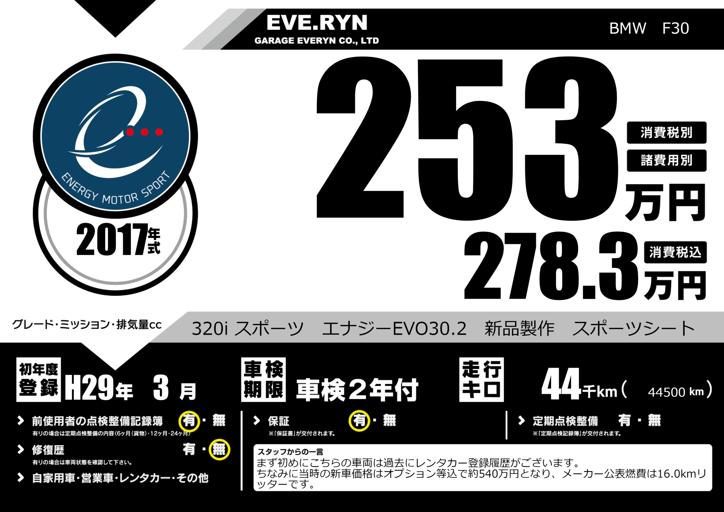 | 車名 | BMW F30 | グレード ミッション 排気量 |
