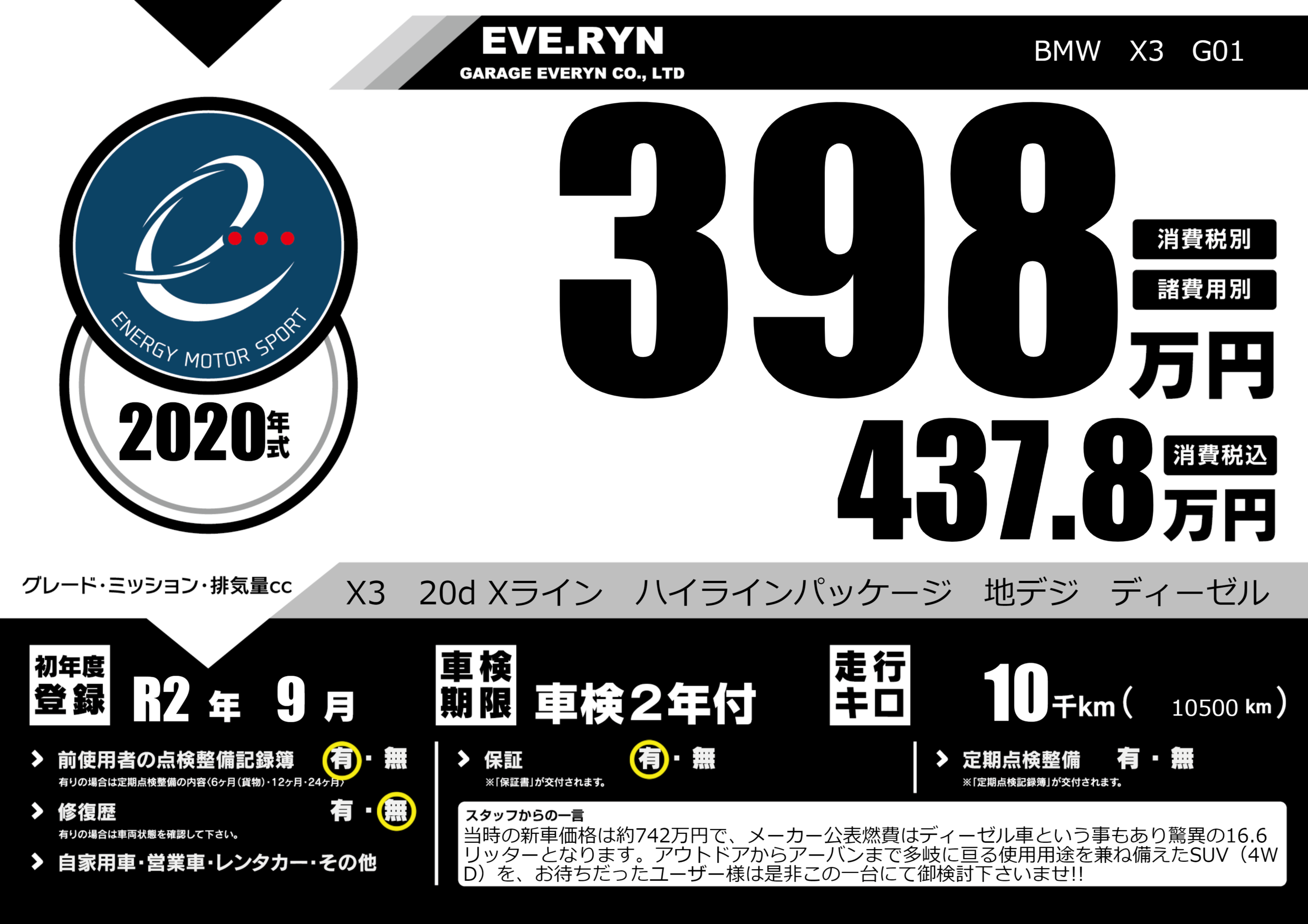 | 車名 | BMW X3 G01 | グレード ミッション 排気量 |