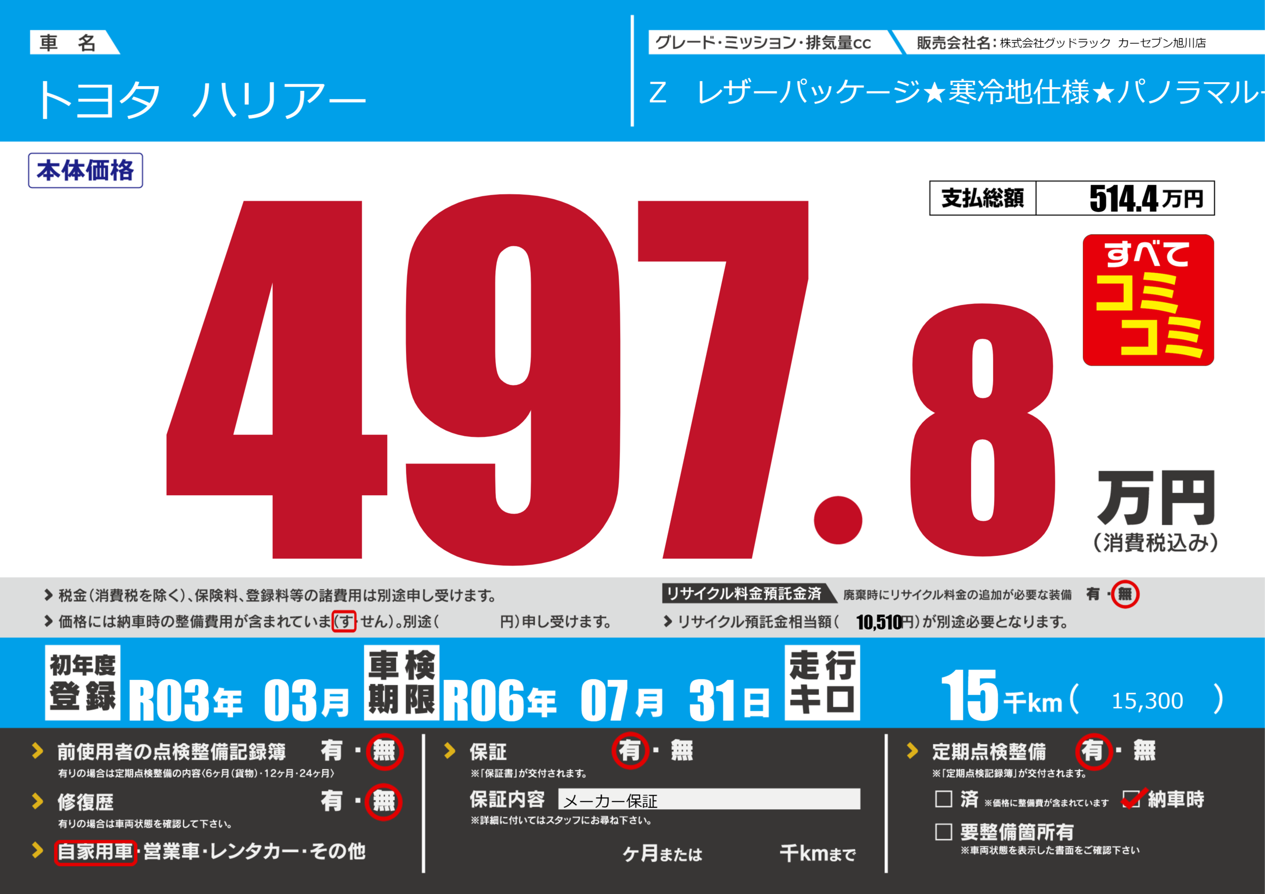 | 走行キロ | 1.5万km | 初年度登録 | R03年03月 |