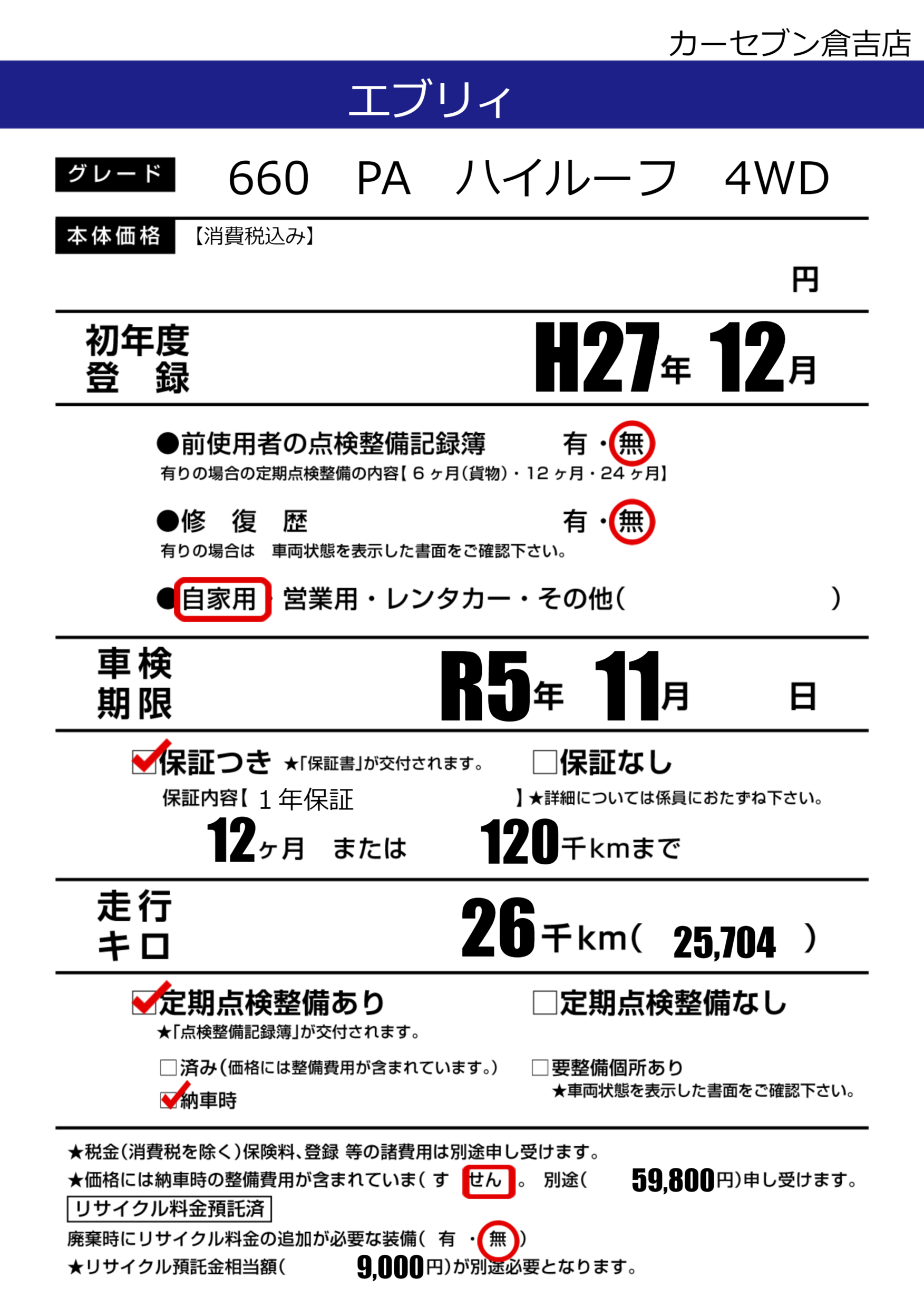| 車名 | エブリィ | グレード ミッション 排気量 |