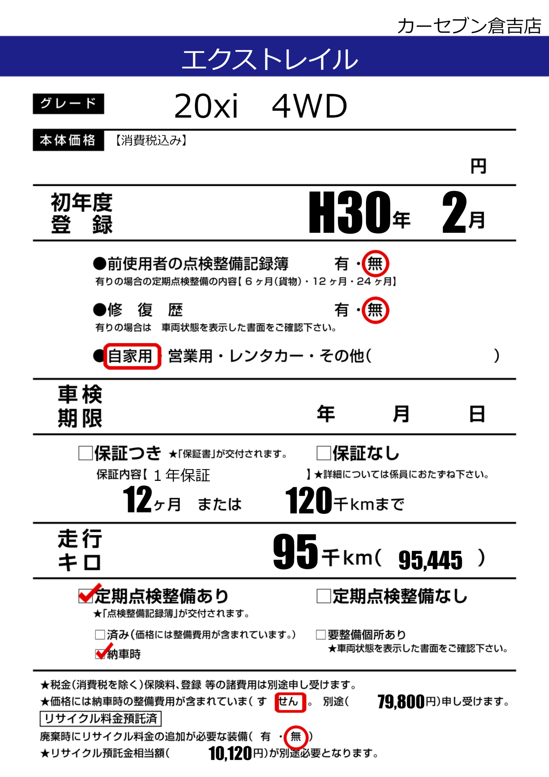 | 車名 | エクストレイル | グレード ミッション 排気量 |