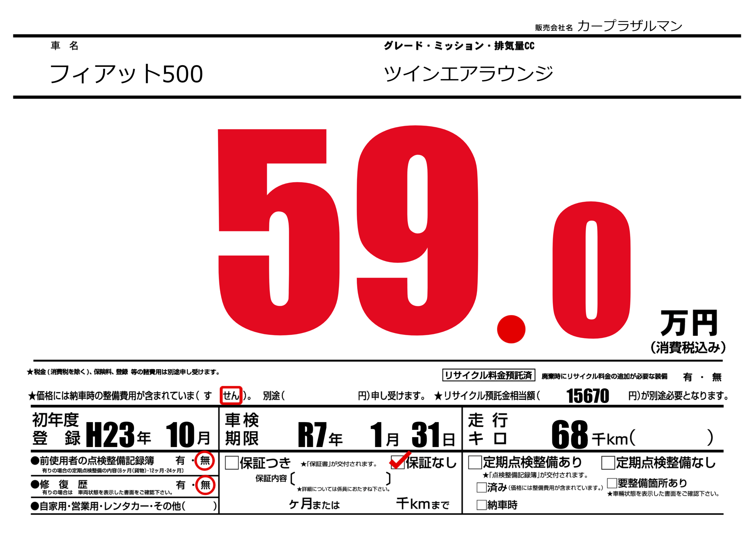 | 車名 | フィアット500 | グレード ミッション 排気量 |