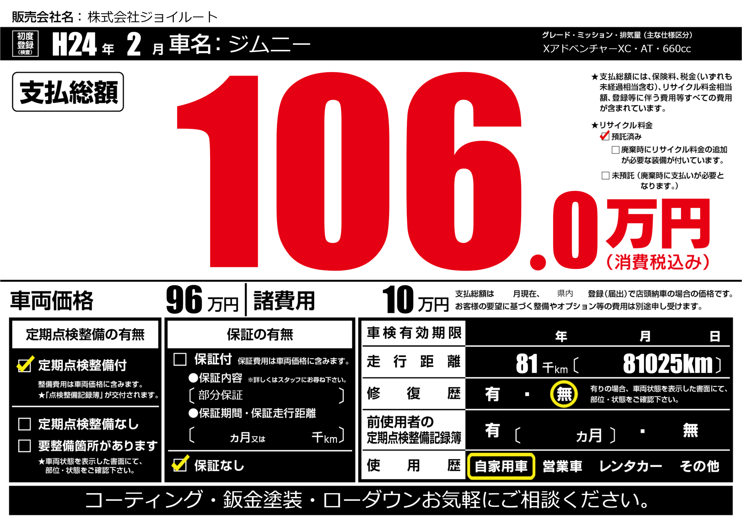 | 車名 | ジムニー | グレード ミッション 排気量 |