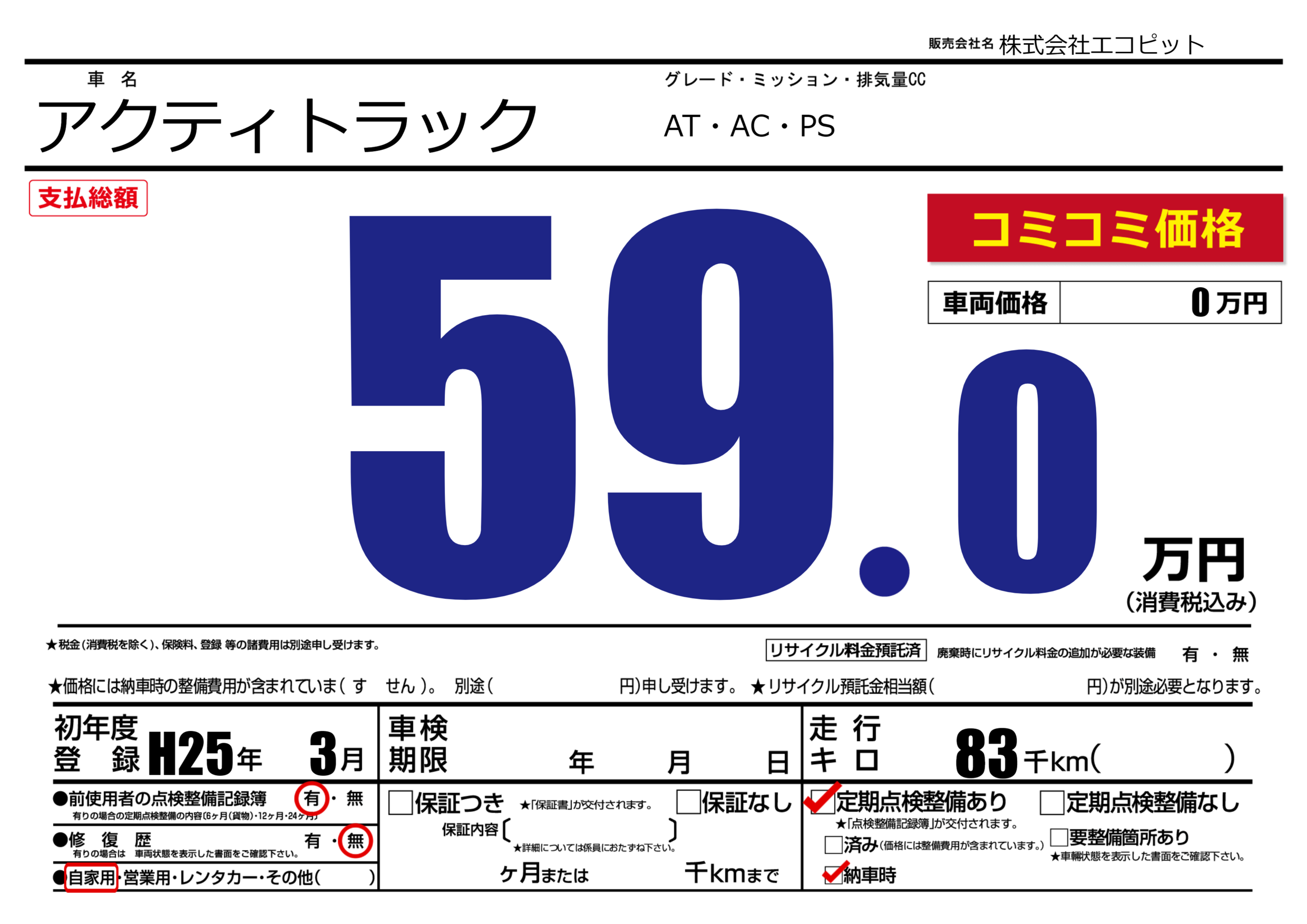 | 車名 | アクティトラック | グレード ミッション 排気量 |