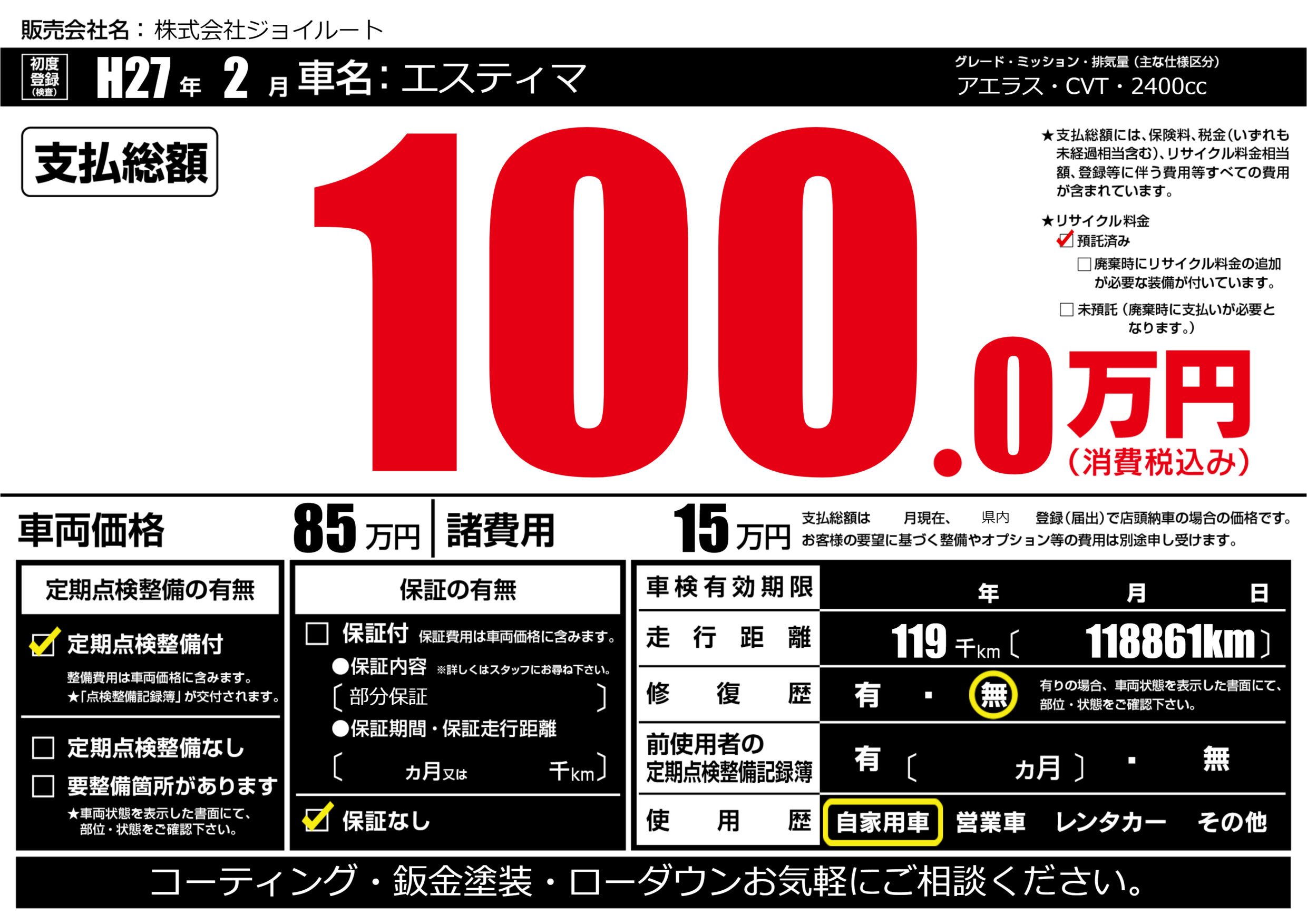 保証なし 保証内容(部分保証) ---ヶ月または()千kmまで |