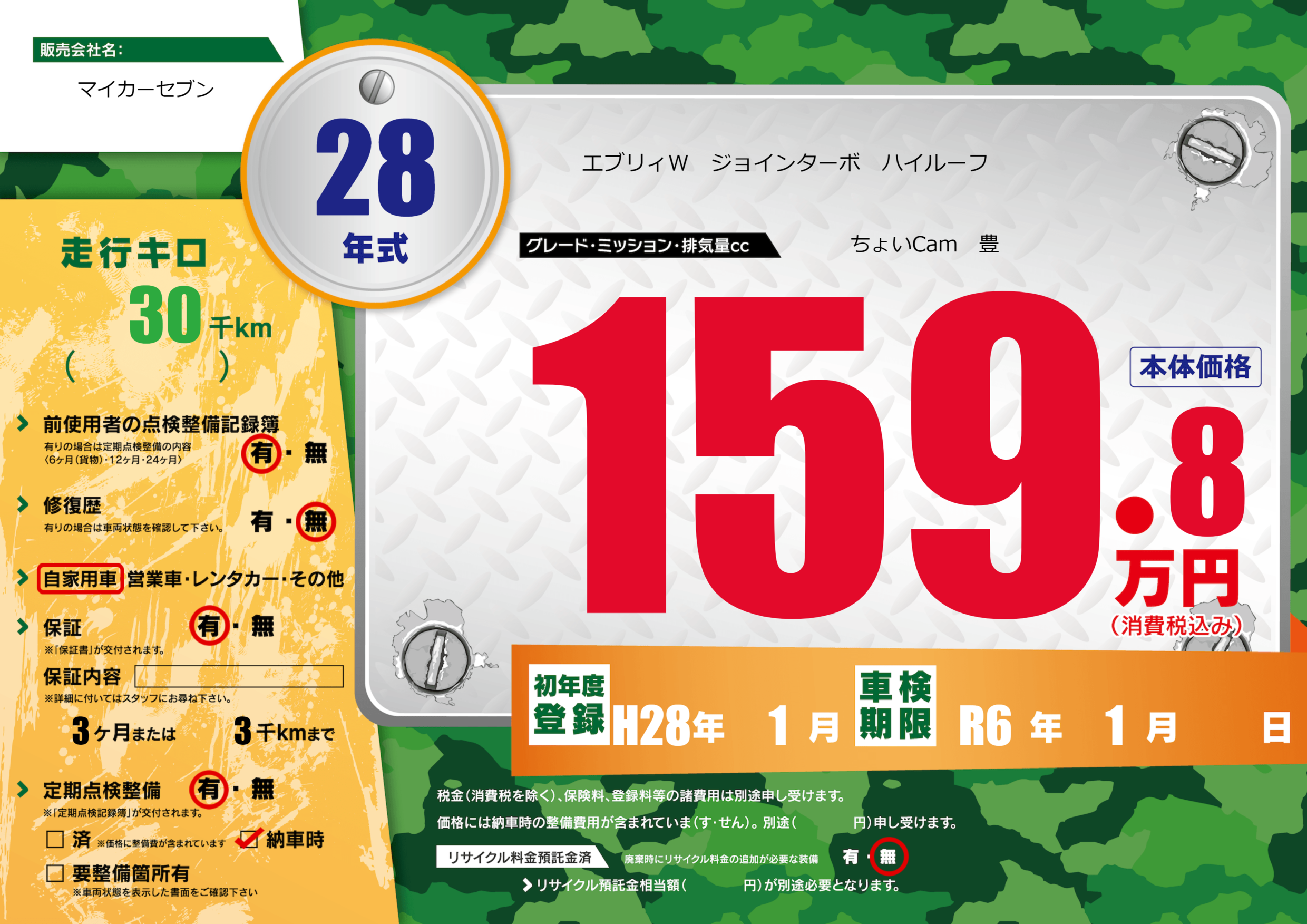 | 車名 | エブリィW ジョインターボ ハイルーフ | グレード ミッション 排気量 |