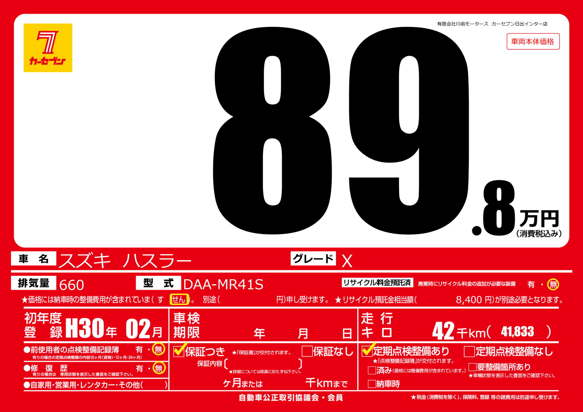 | 車名 | スズキ ハスラー | グレード ミッション 排気量 |