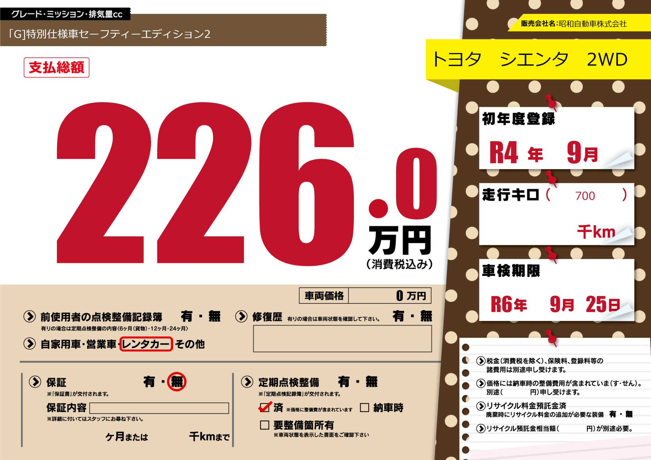 | 車名 | トヨタ シエンタ 2WD | グレード ミッション 排気量 |
