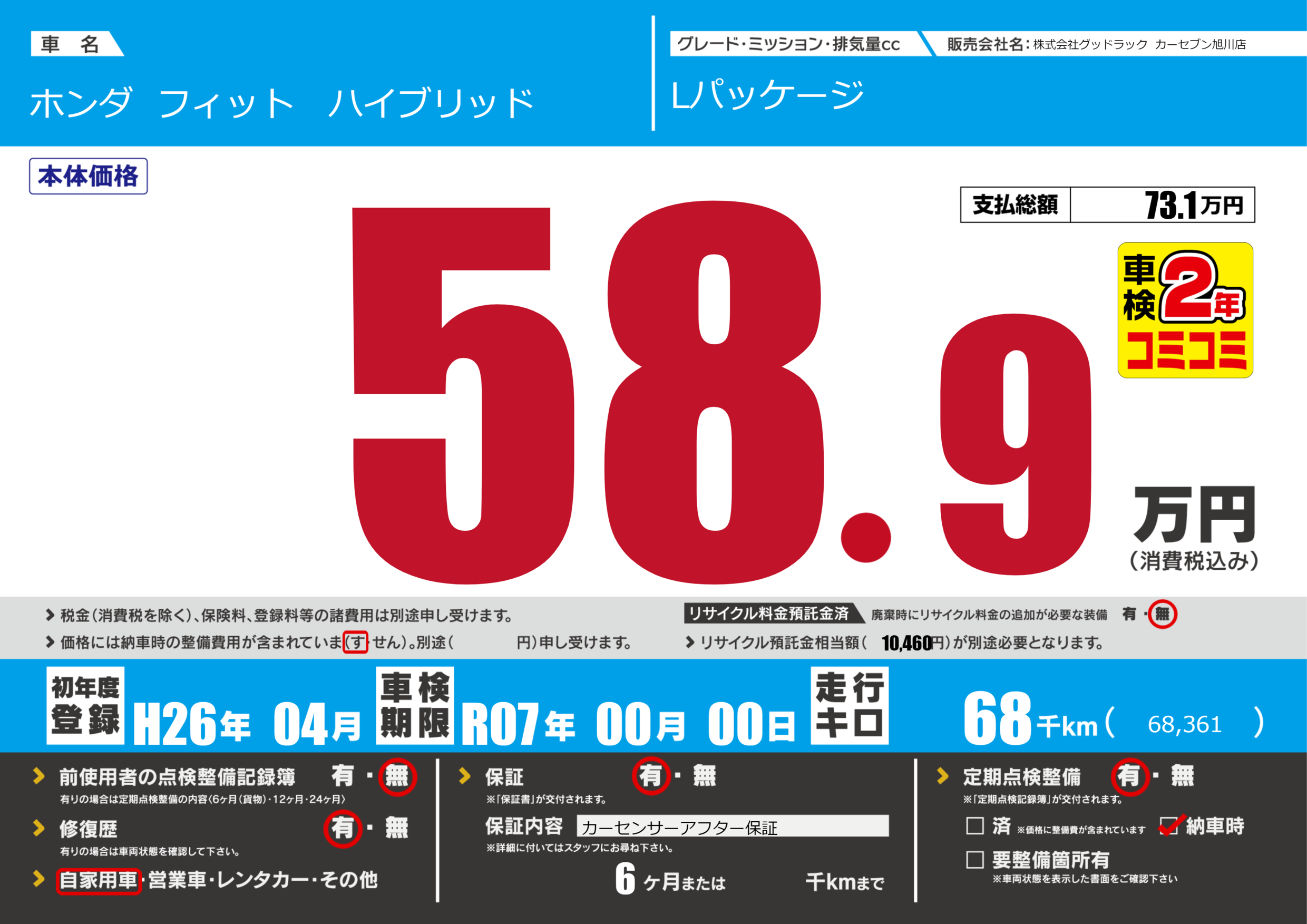 | 車名 | ホンダ フィット ハイブリッド | グレード ミッション 排気量 |