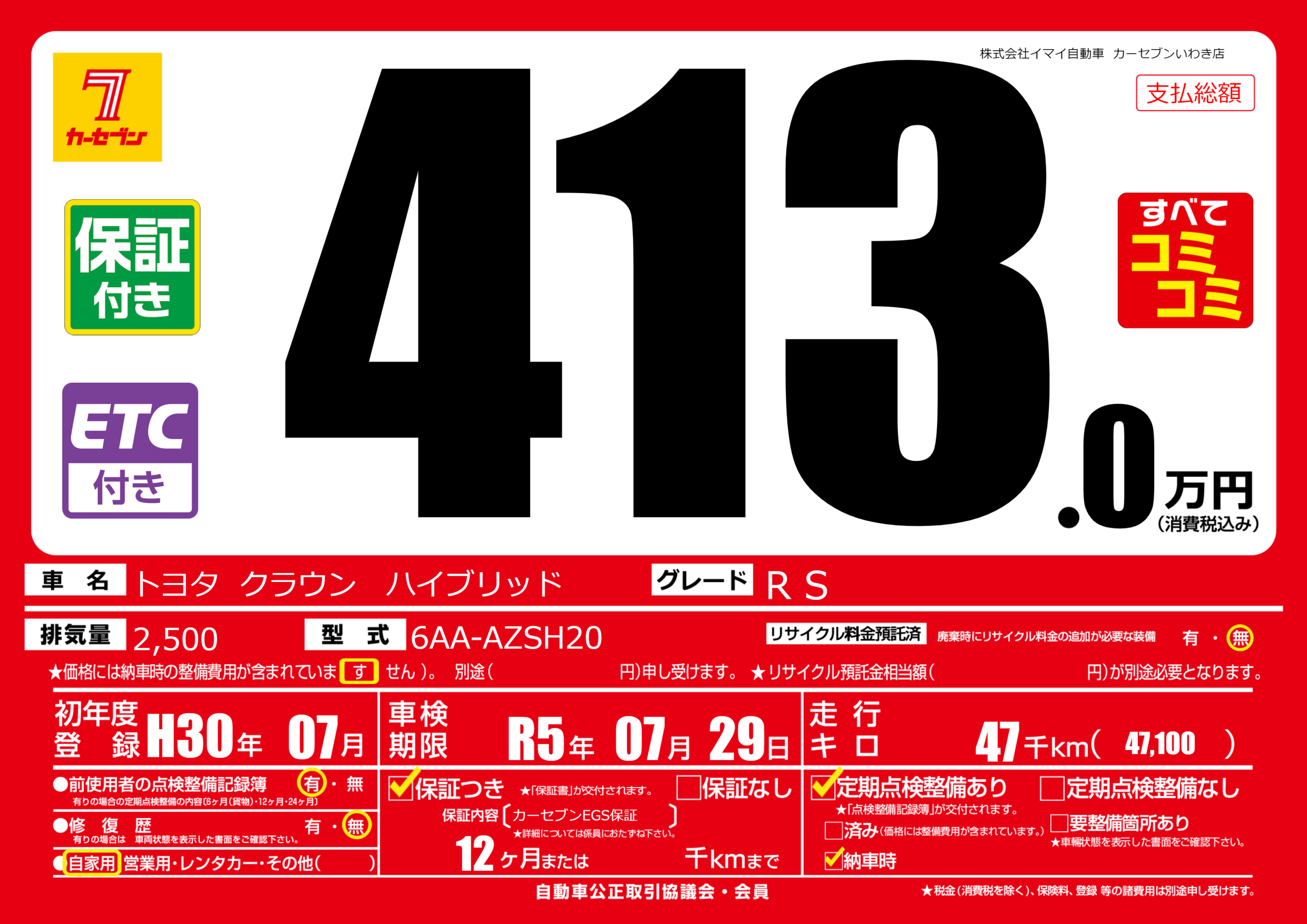 保証付き 保証内容(カーセブンEGS保証) 12ヶ月または千km |