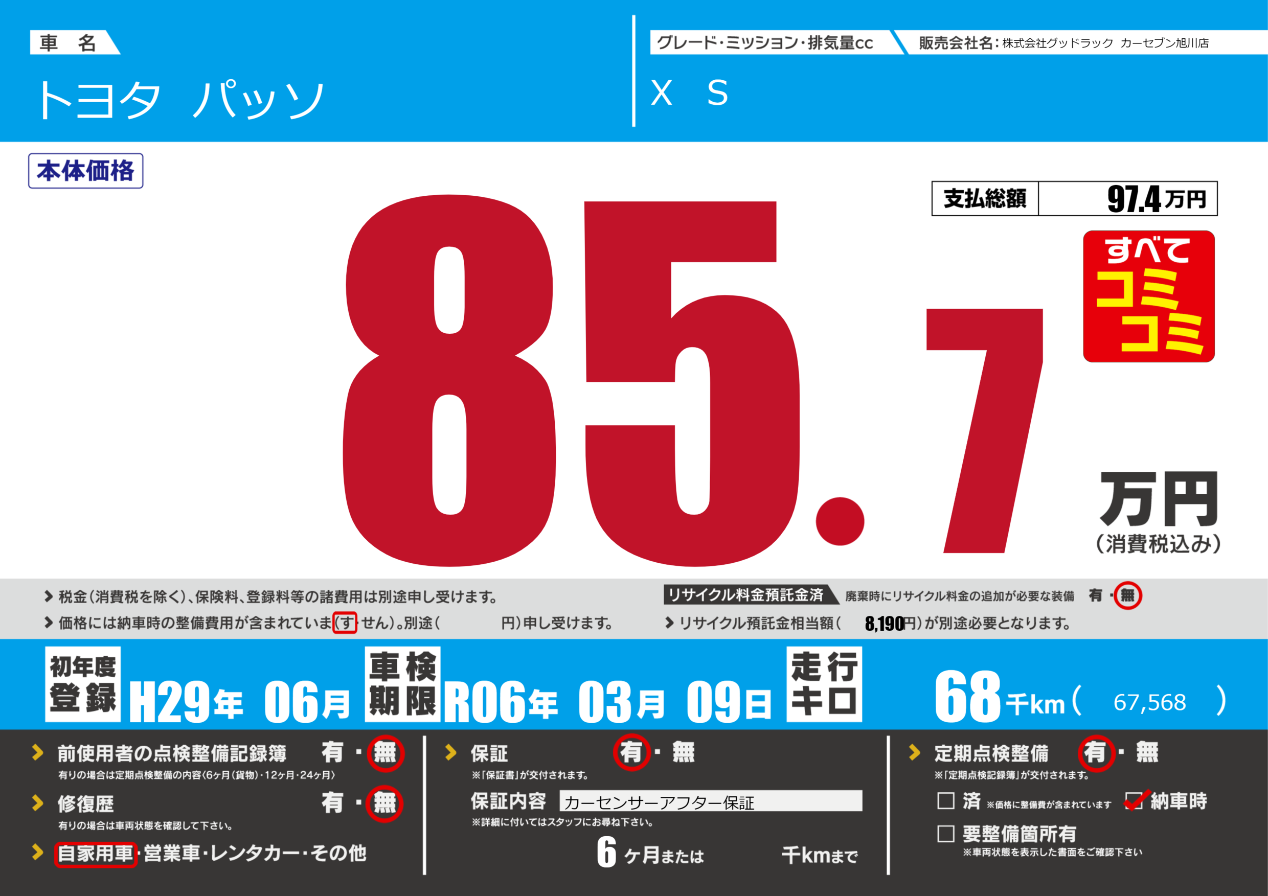 | 車名 | トヨタ パッソ | グレード ミッション 排気量 |