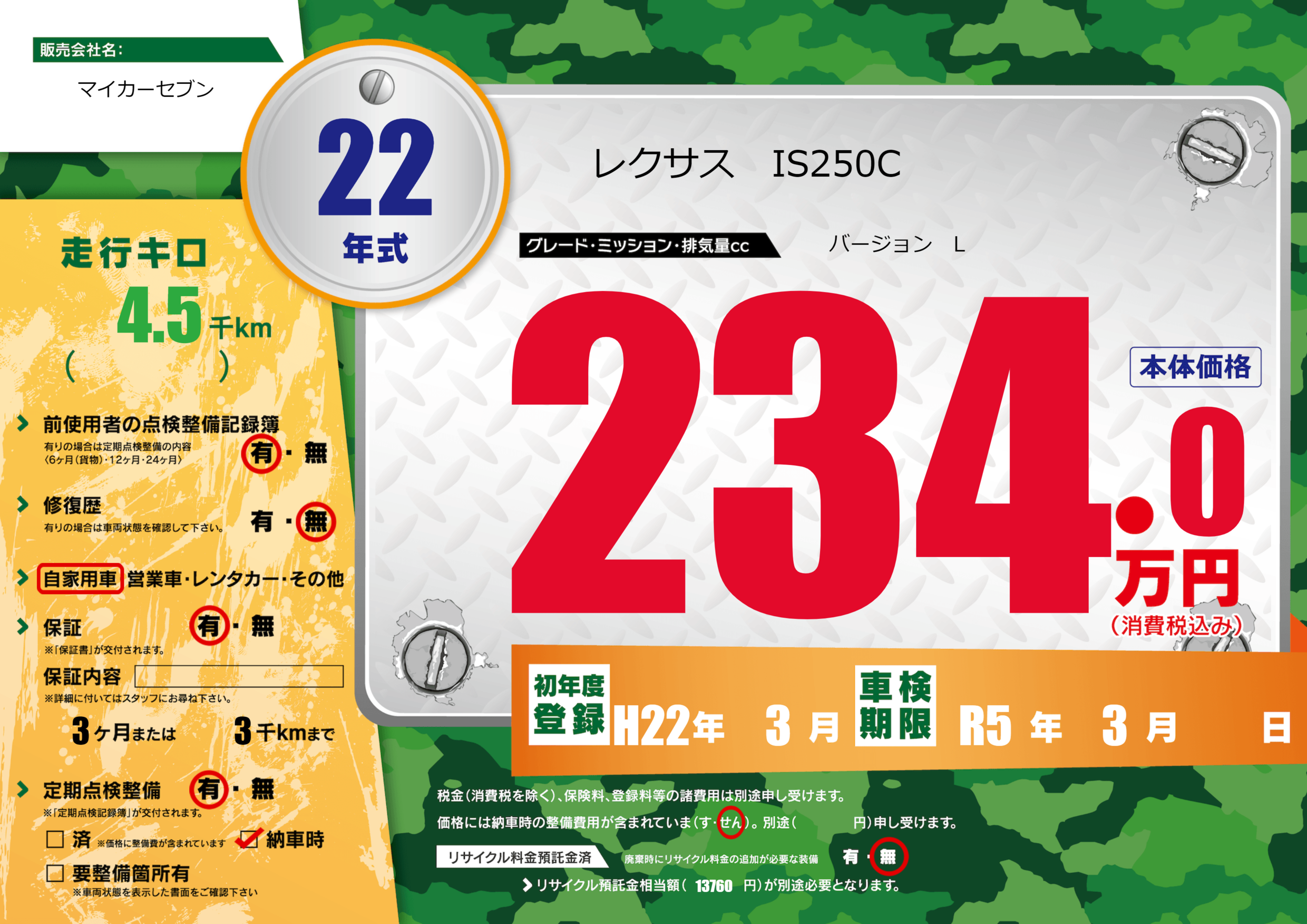 なし | 車検制限 | R5年3月---月 |