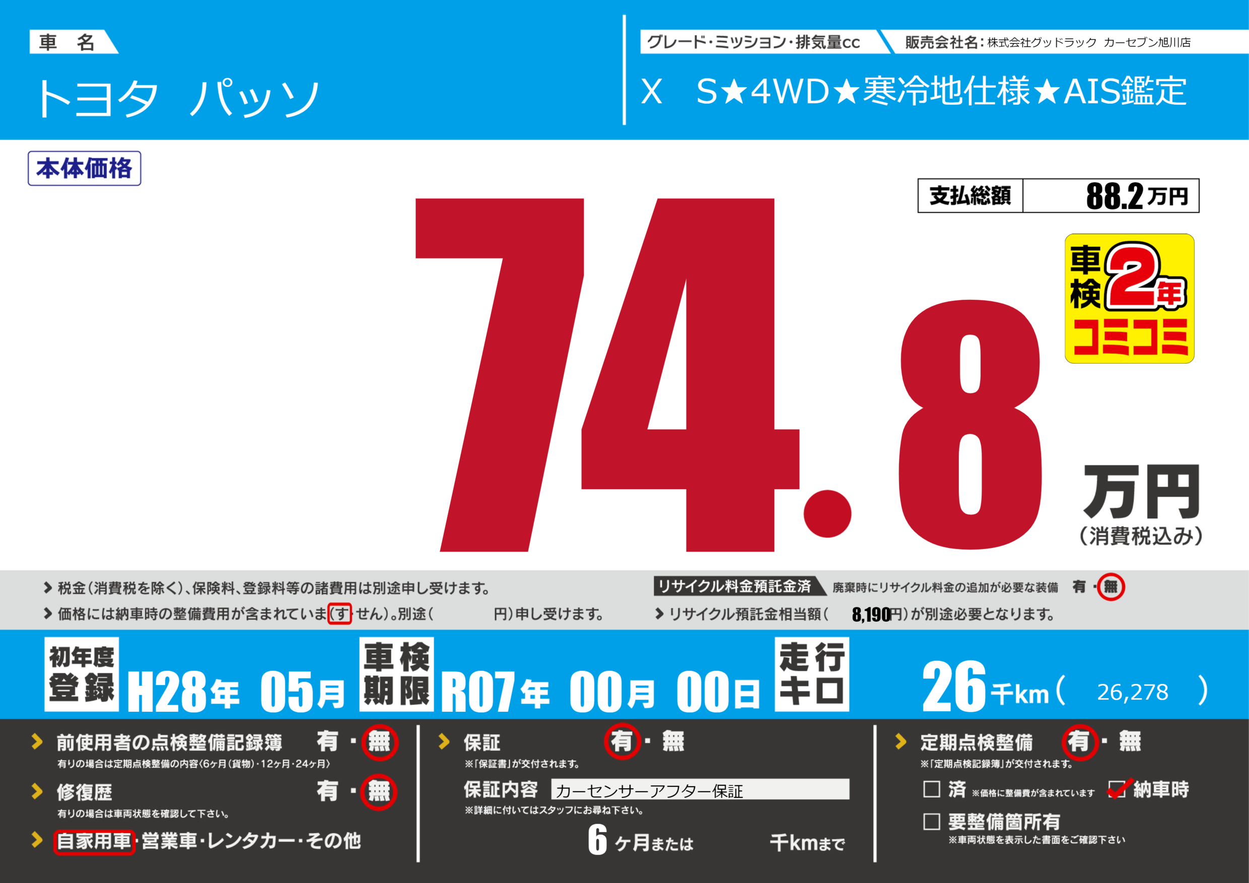 | 車名 | トヨタ パッソ | グレード ミッション 排気量 |