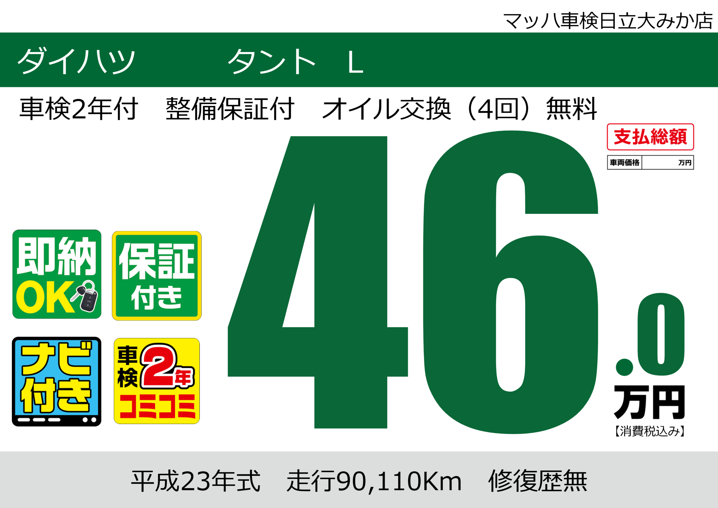 | 車名 | ダイハツ タント L | グレード ミッション 排気量 |