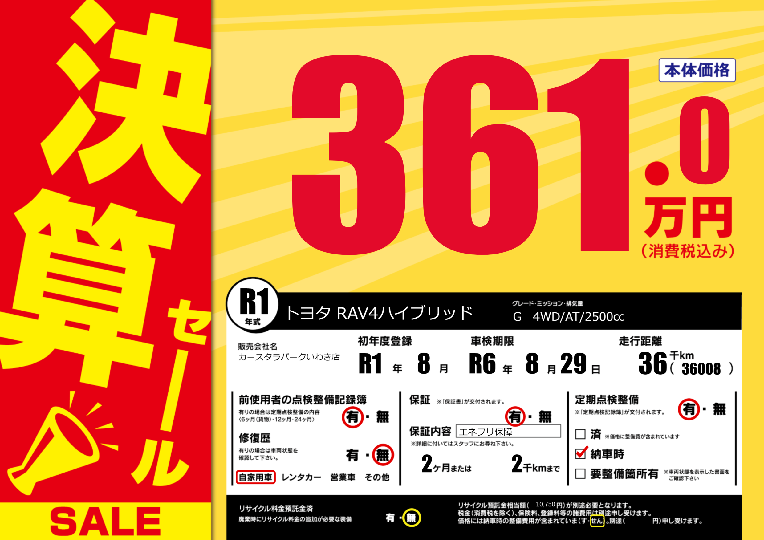 | 走行キロ | 3.6万km | 初年度登録 | R1年8月 |