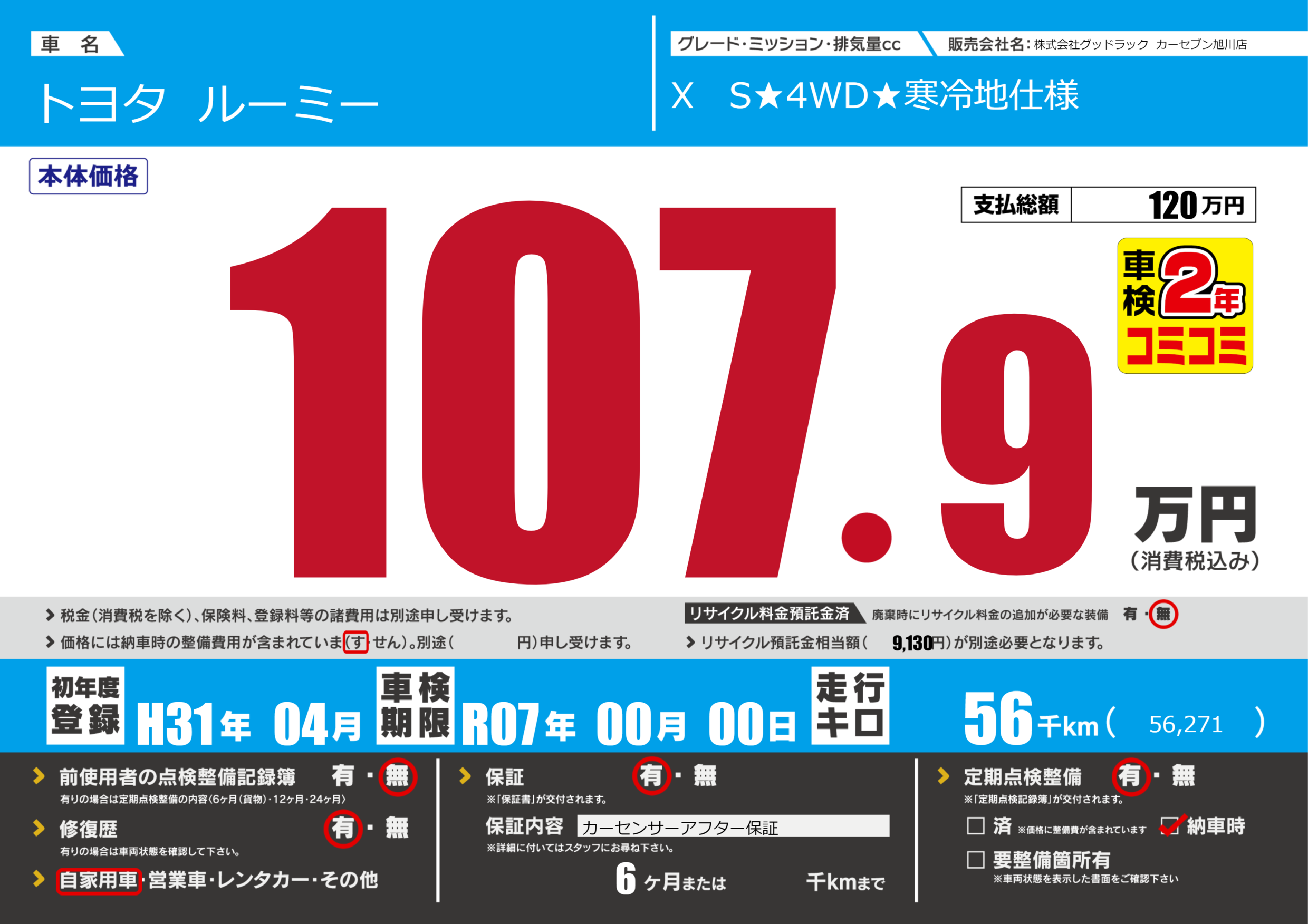 | 車名 | トヨタ ルーミー | グレード ミッション 排気量 |