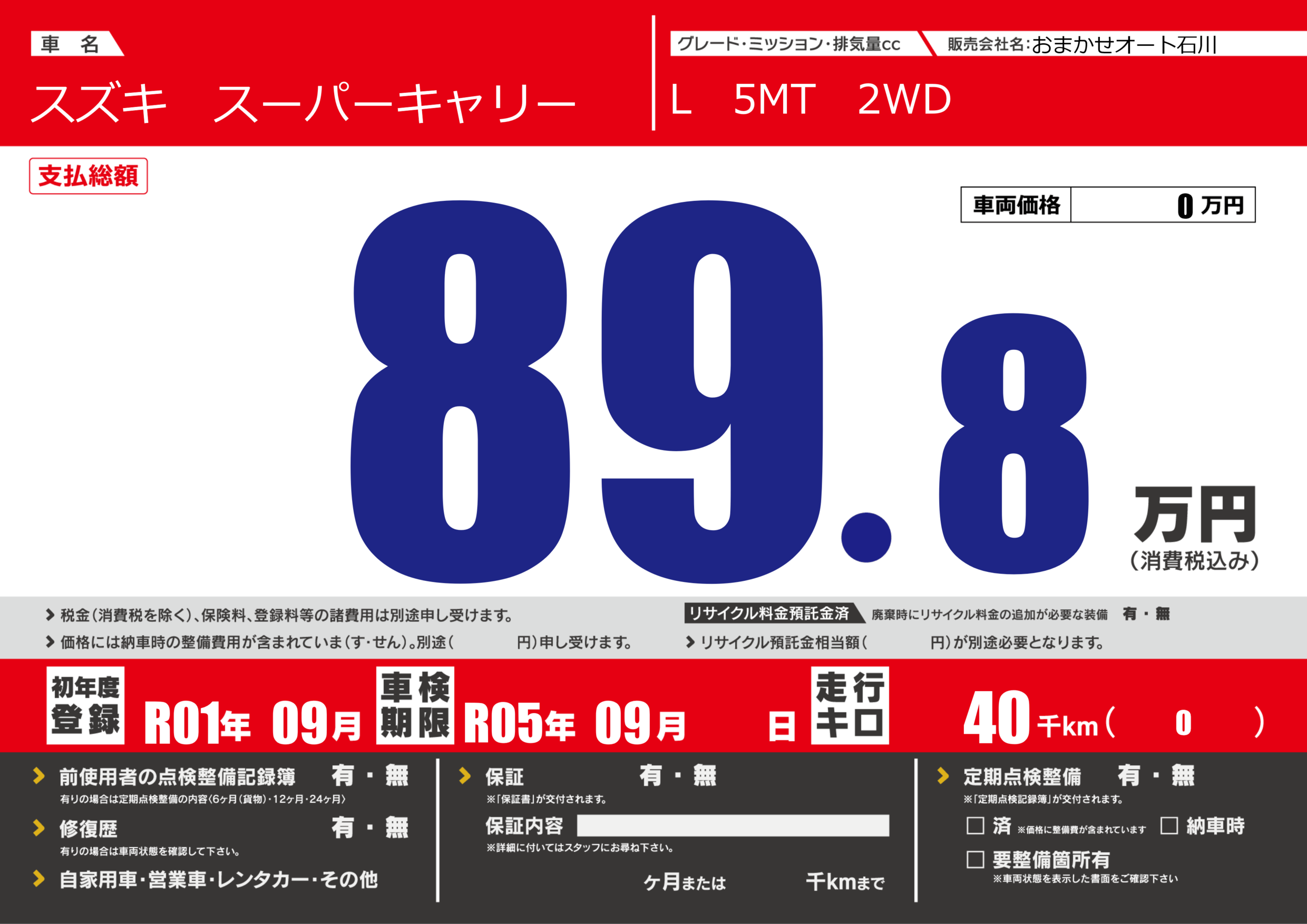 | 車名 | スズキ スーパーキャリー | グレード ミッション 排気量 |