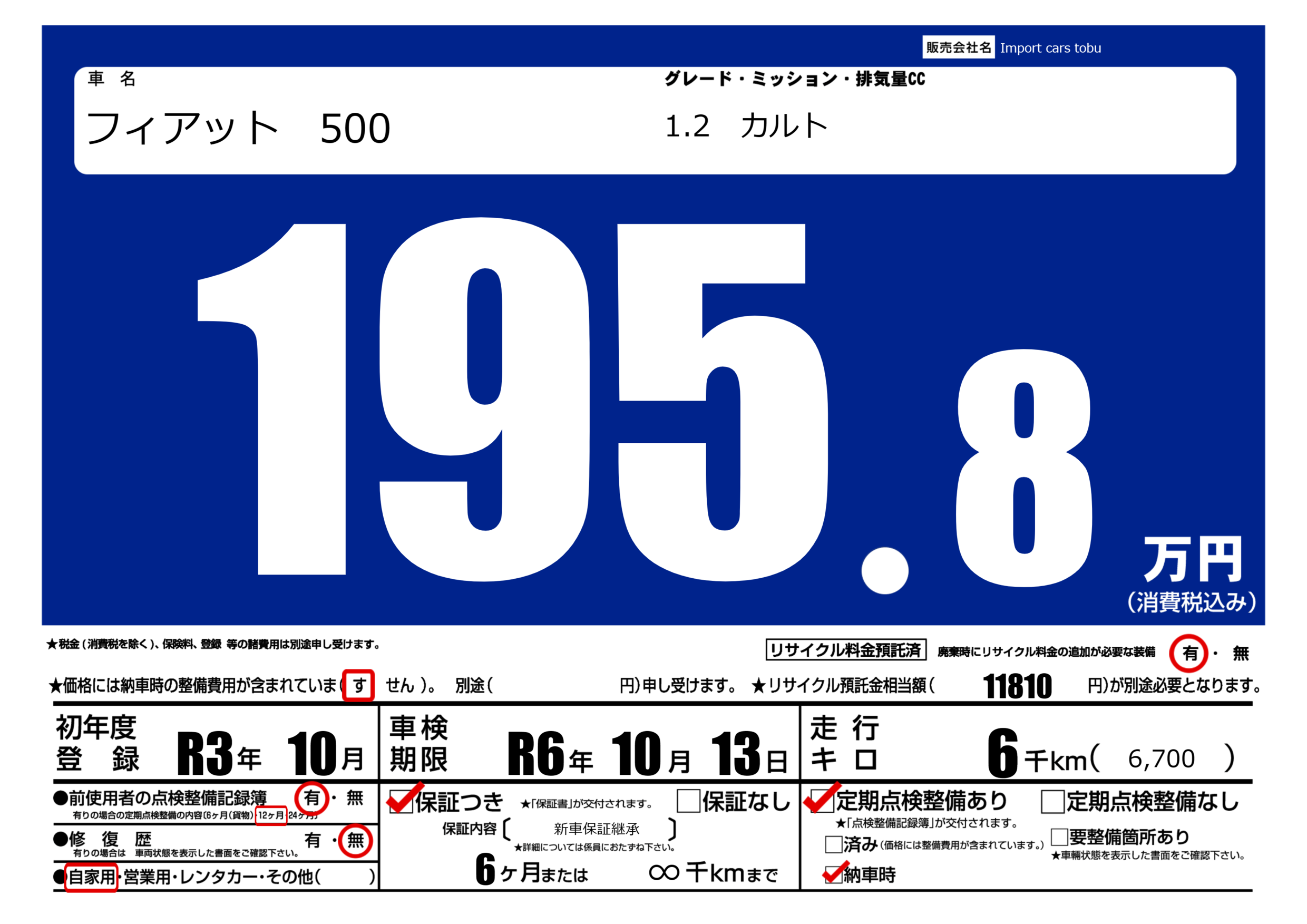 | 車名 | フィアット 500 | グレード ミッション 排気量 |